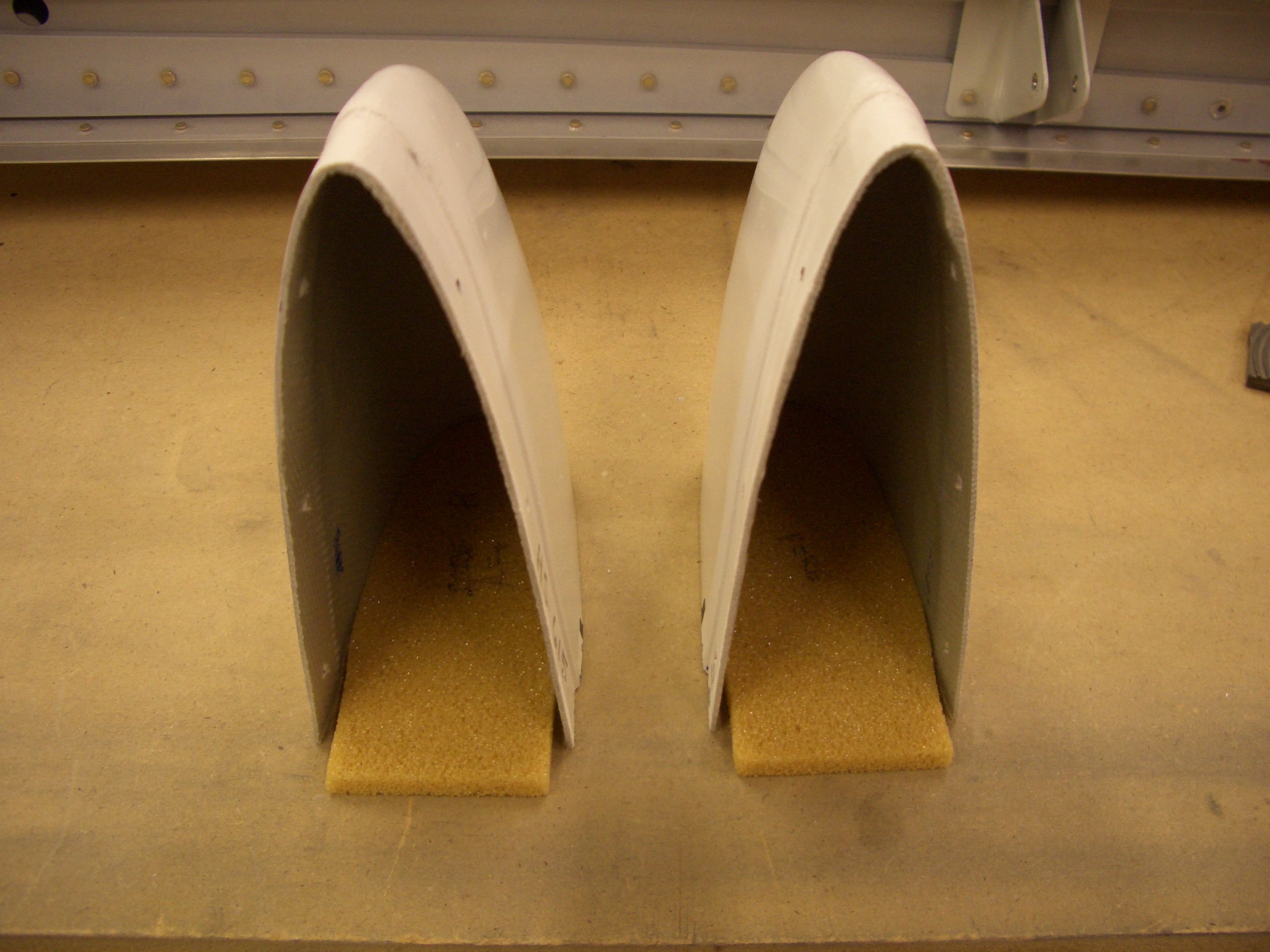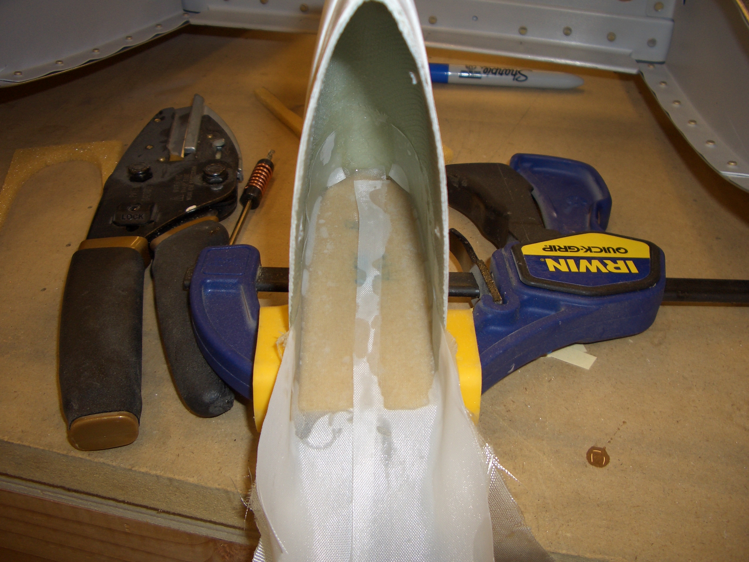 I epoxied the foam in place and put a couple of pieces of 1.45 oz/sq yd glass in place to bond them to the sides. It’s a lot warmer in the garage than when I did the vertical stabilizer tip, and the epoxy kicked off a lot faster. I ended up having to mix a second batch to finish the other tip. That’s really all I can do tonight since I have to wait until this cures.