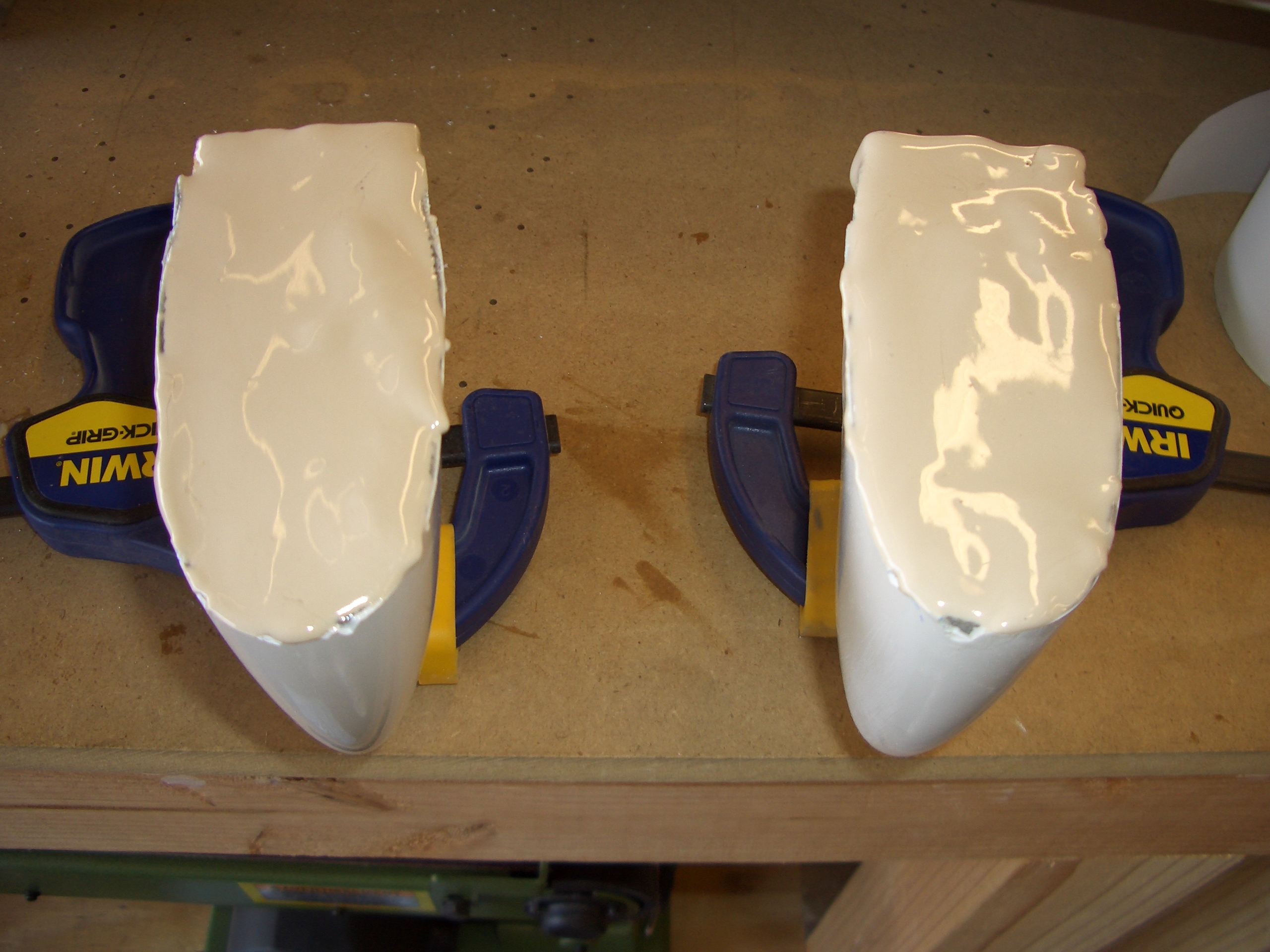 I mixed up some epoxy and microlight filler and filled the end of the elevator tips. This stuff is incredibly light. A five ounce container of the microlight additive fills a container about the size of a two liter bottle of soda. It’s great for filling and fairing.
