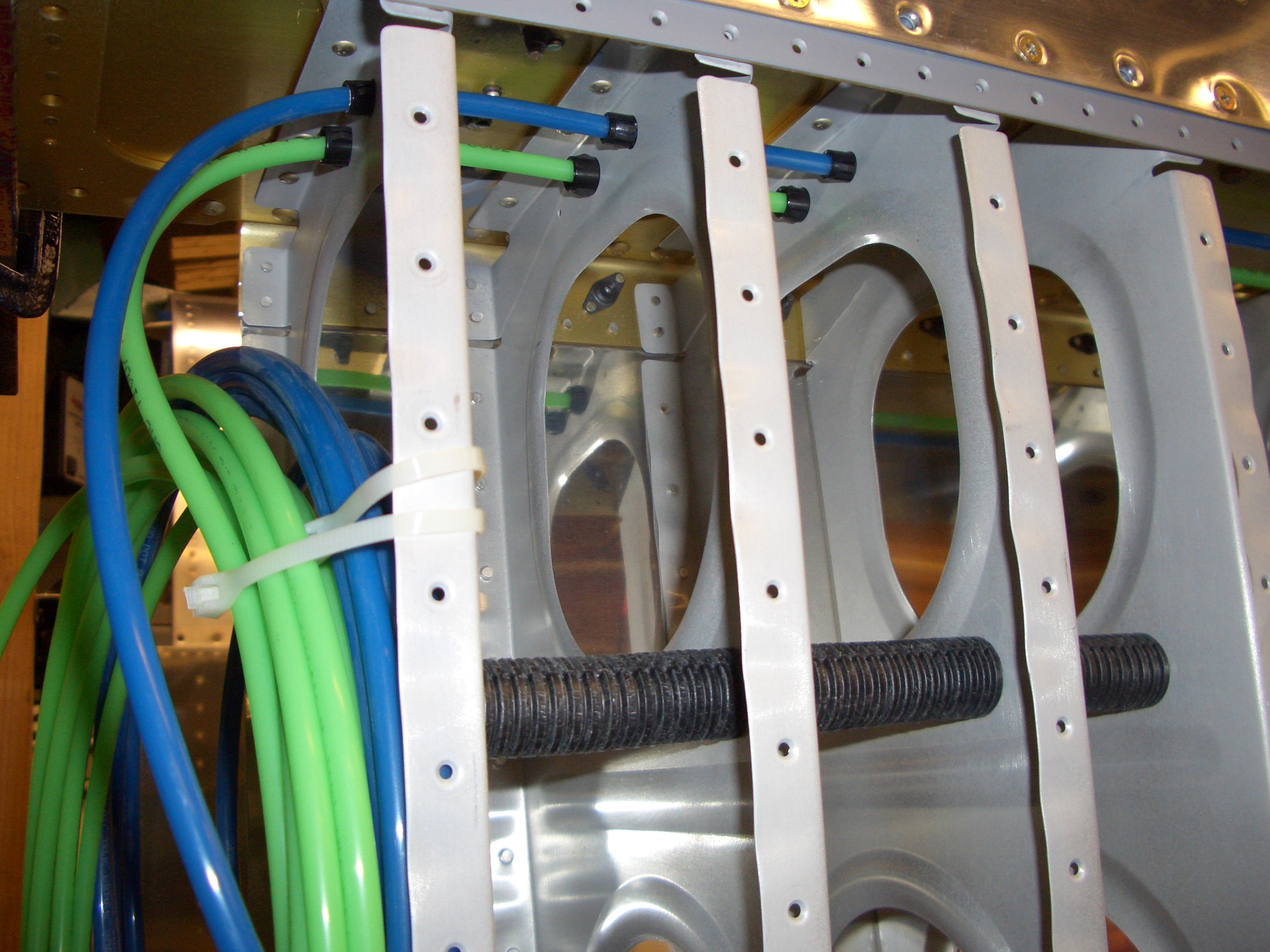 My 437-4 snap bushings showed up from Aircraft Spruce today, so I was able to install them and run the green pitot tubing through the right wing.