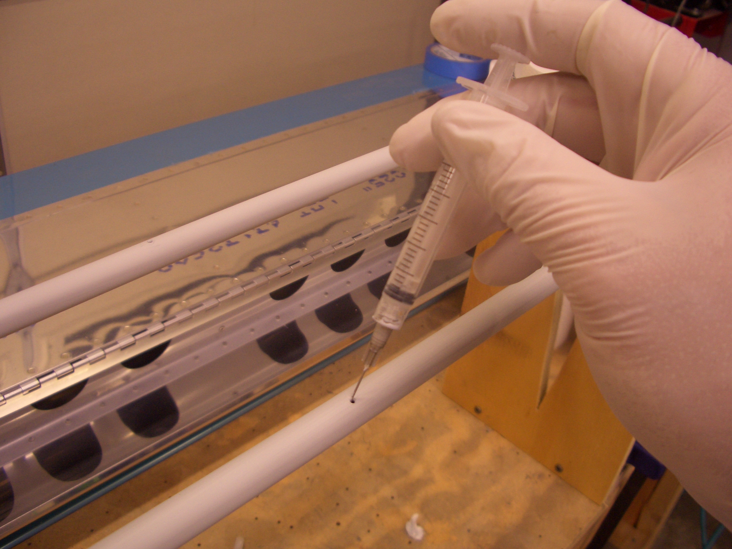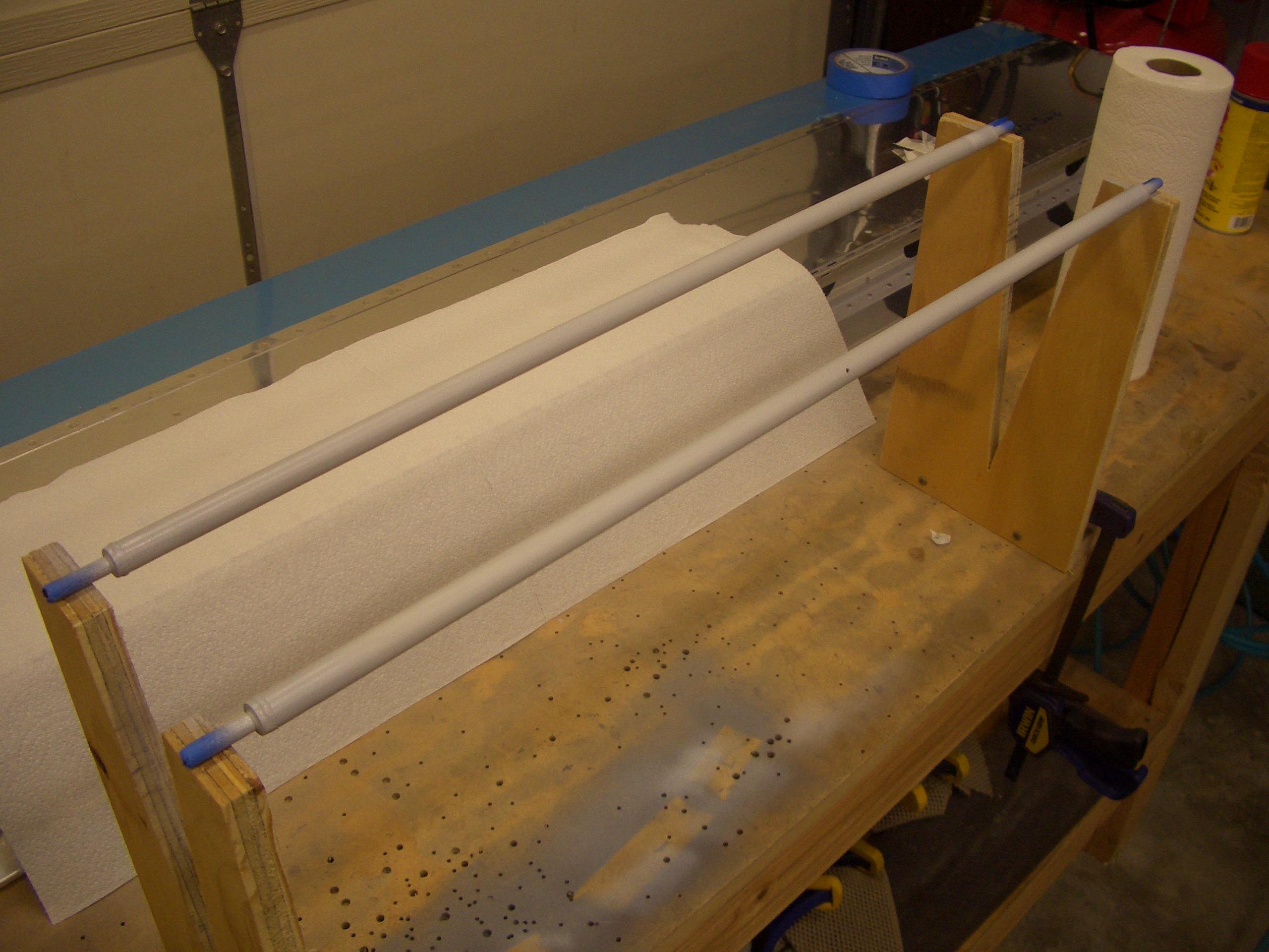 I think tonight will be the last priming session for the wing. I mixed up some epoxy primer and injected a few ccs into each aileron push tube through the hole that the welder drilled to relieve pressure during welding. I then swirled the tubes around to coat the entire inside with the primer.