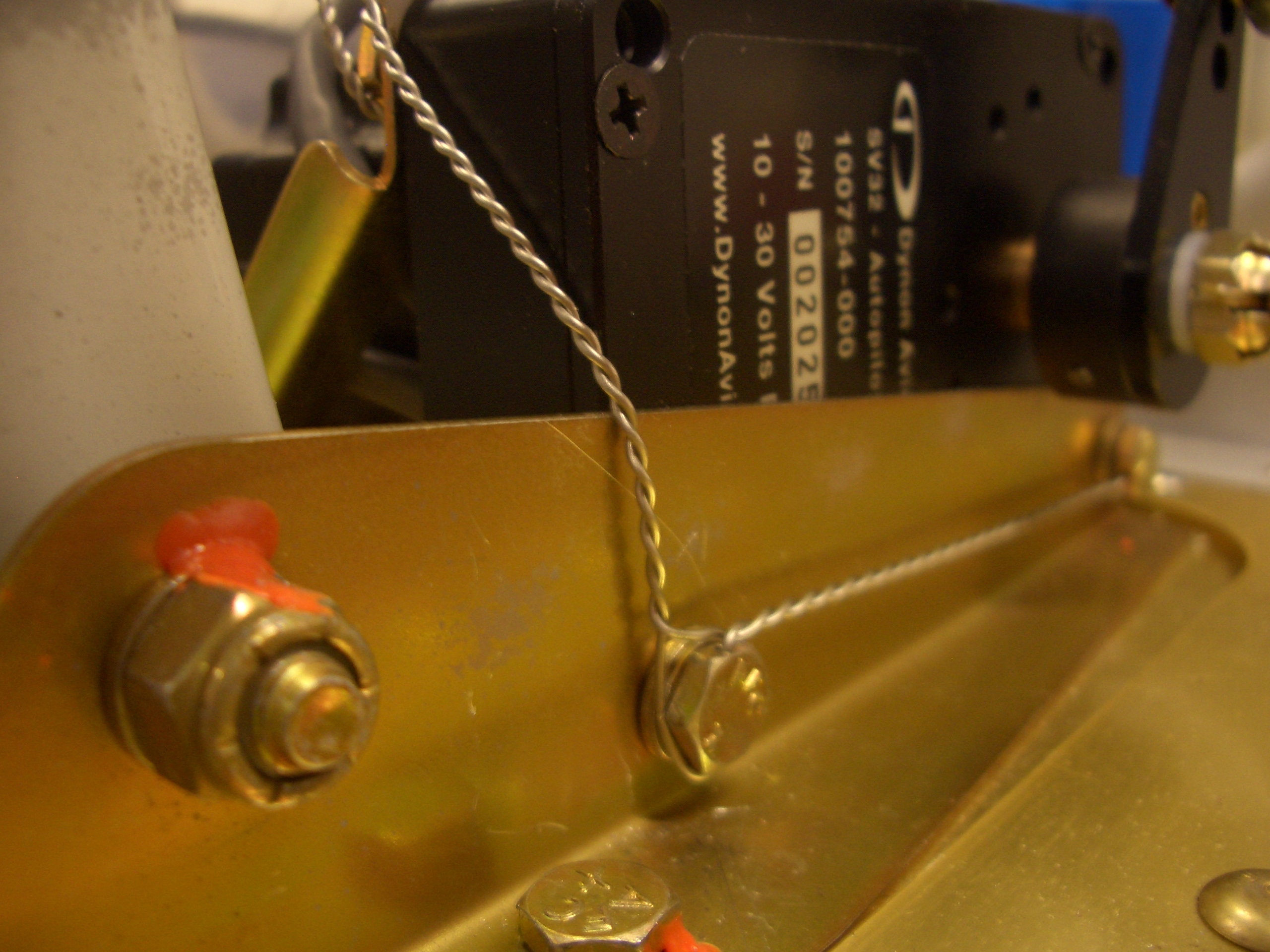 I also safety wired the autopilot roll servo’s mounting bolts. I’m still getting the hang of safety wiring. It’s tricky to estimate how much extra wire to leave before twisting since the wire segment shortens as you twist it. It only took two tries to get this properly secured.