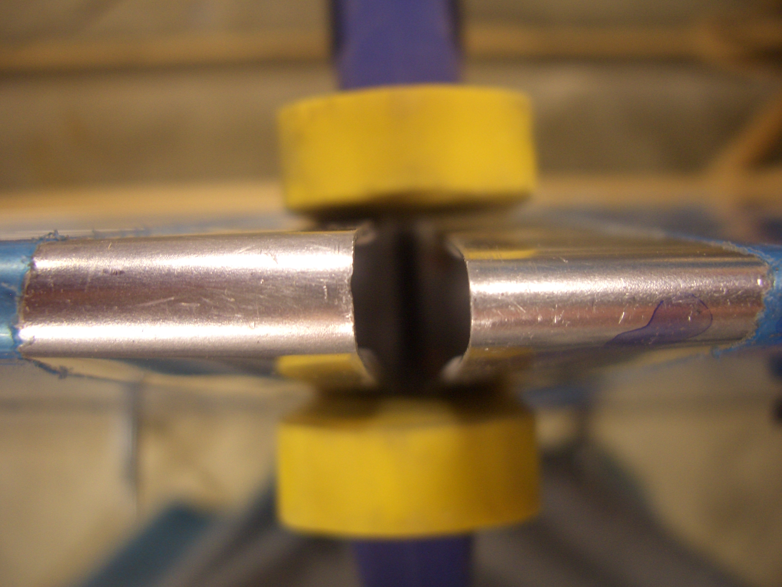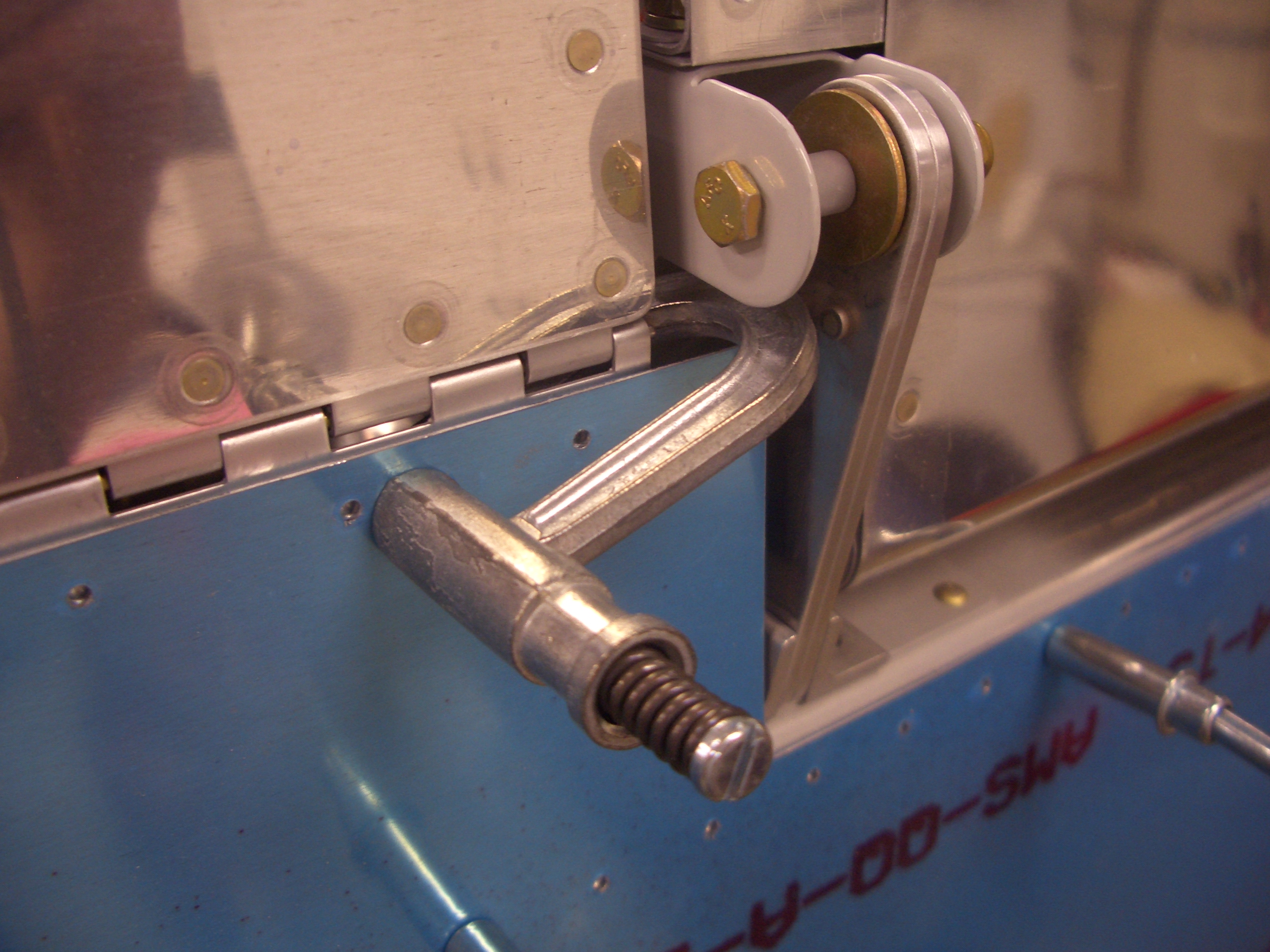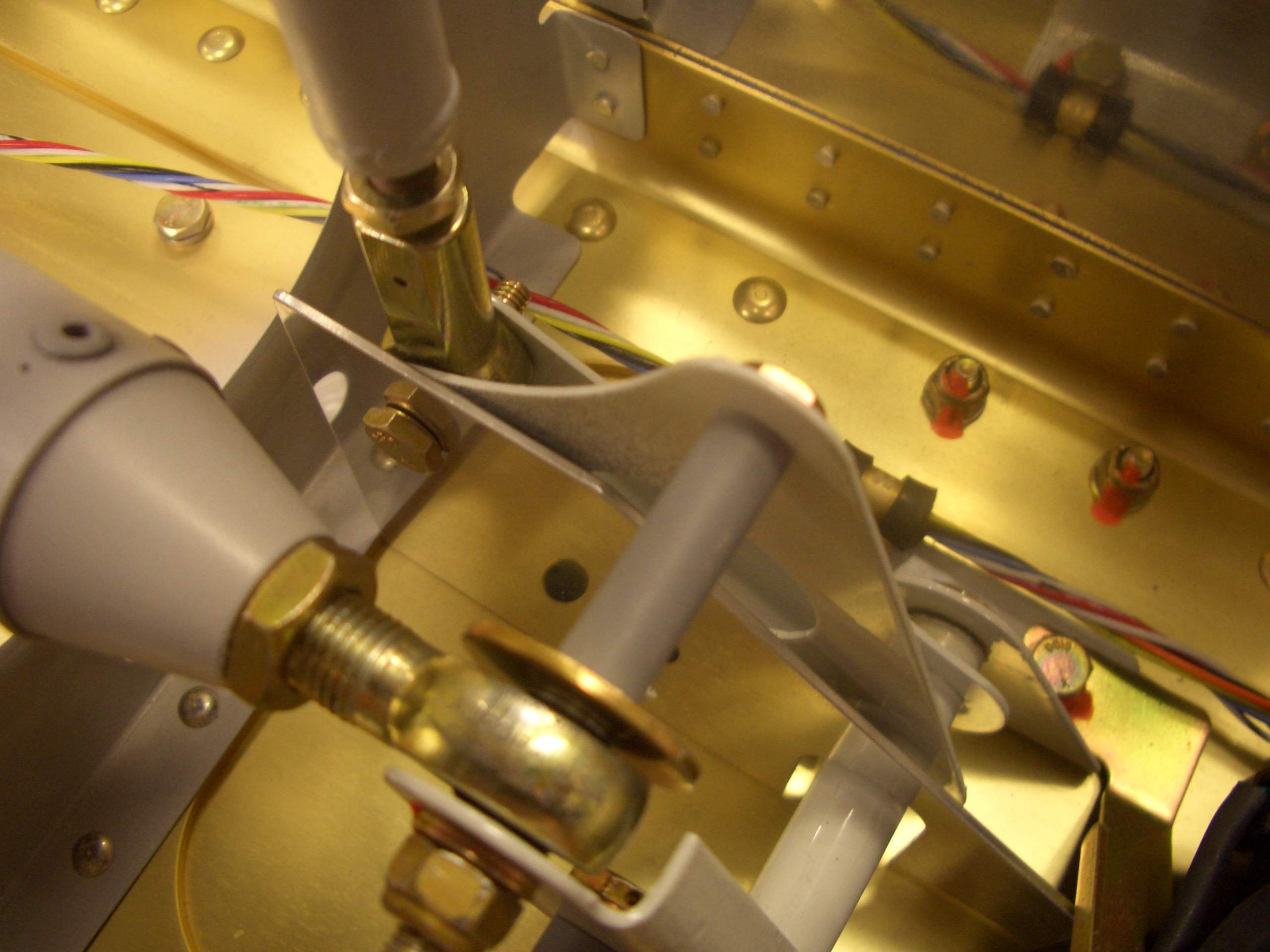 The first step in rigging the ailerons is to place the aileron alignment bracket over the bellcrank with a bolt through it and the rear aileron push tube’s end bearing.