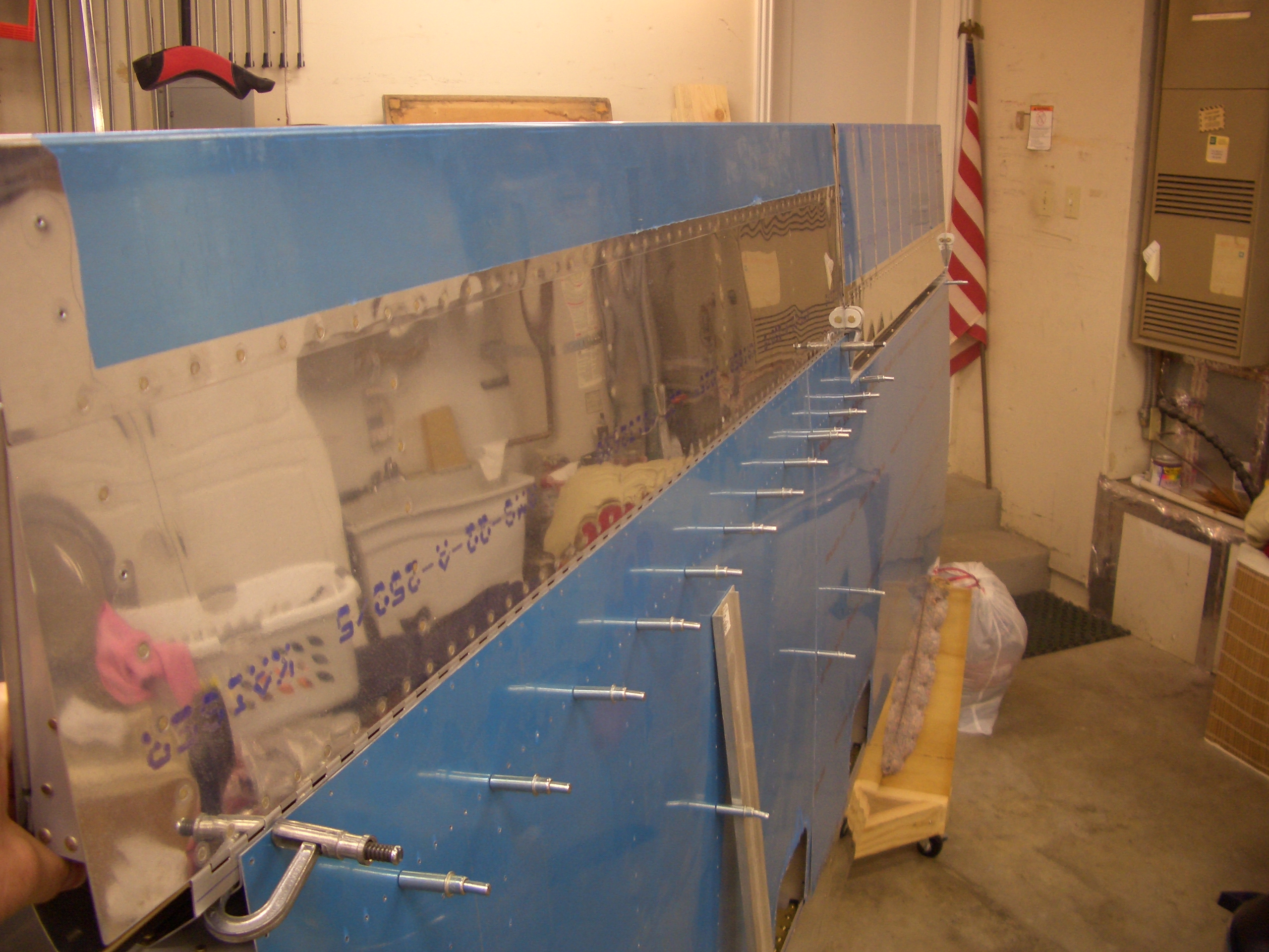 Next up, I clecoed on the bottom skins and put the right flap in place. I spent awhile adjusting the position of the end clamps to get the trailing edges in perfect alignment.