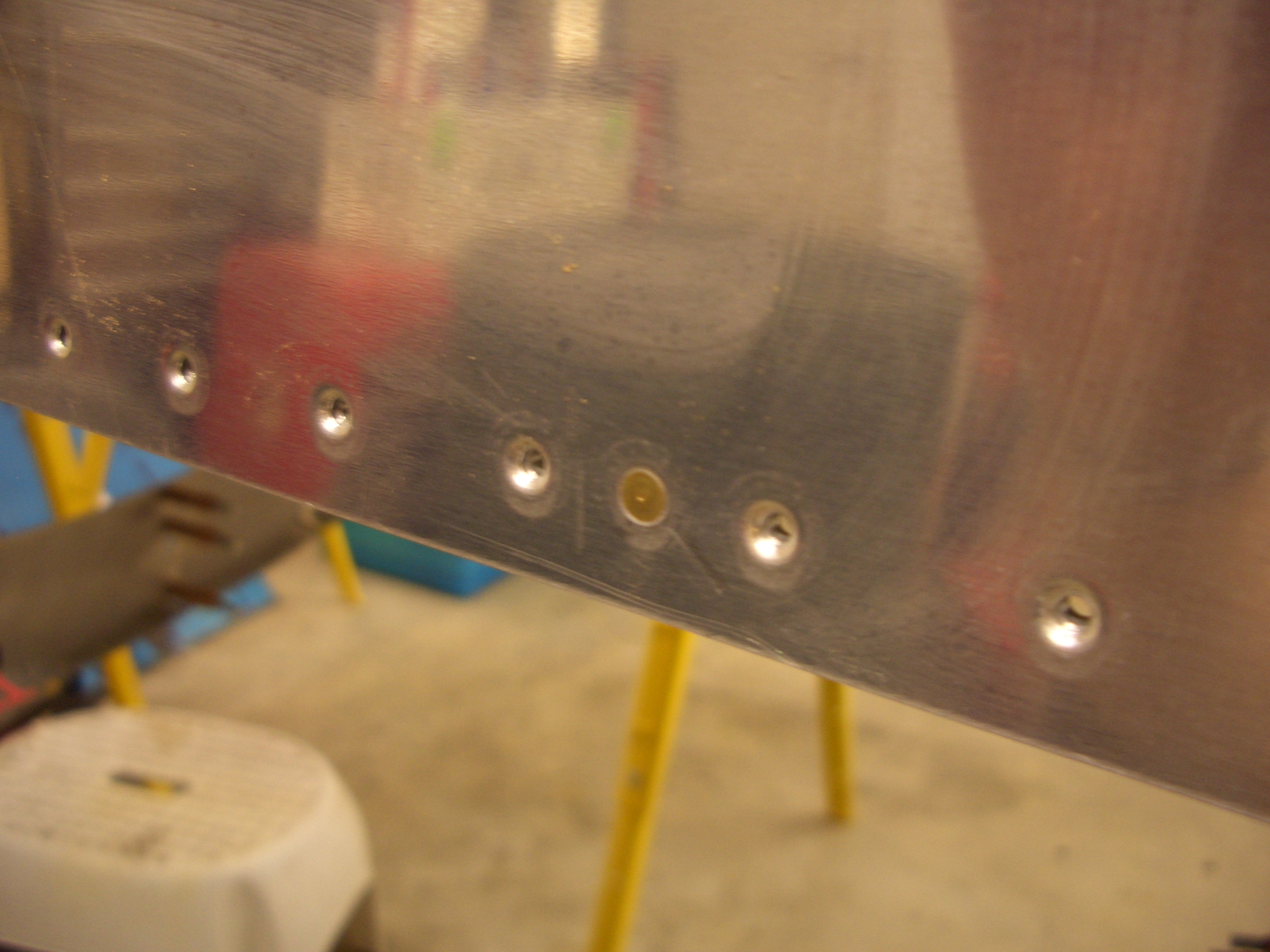 I also squeezed a number of the AN470 rivets just aft of F-704. Near the lower right of the picture, you can see one boogered rivet. There is a nutplate right behind here (on the seat rib flange) and I didn’t notice it when I squeezed the rivet. It didn’t do any significant damage, just slight bends to a couple of pieces.