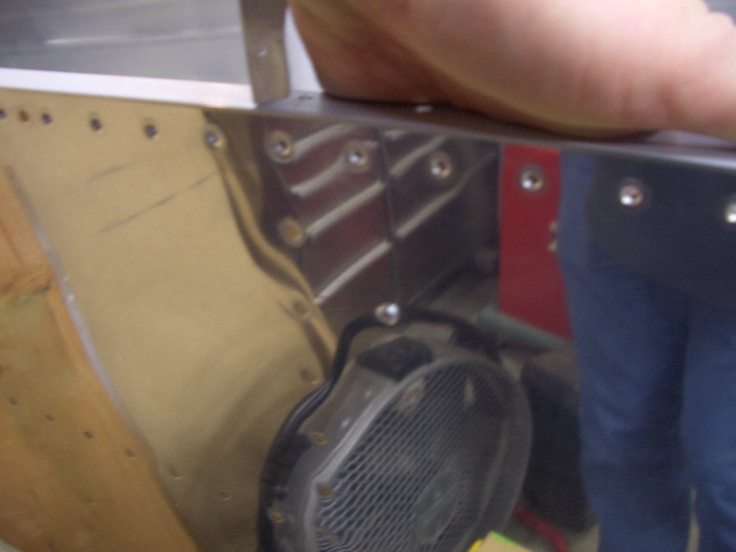 Next, I laid out and drilled for the static ports. I’m using the SafeAir pitot/static/AOA kit, so the flange of the static port doesn’t allow you to install them precisely where Van’s recommends (11/16″ forward of the vertical row of rivets). The position I used is 2″ down from the horizontal row of rivets and 1 1/4″ forward of the vertical row of rivets). Here I’m holding the SafeAir static port in the hole while trying to take a picture. I had a hard time getting my camera to focus on the static port, so this is a little blurry.