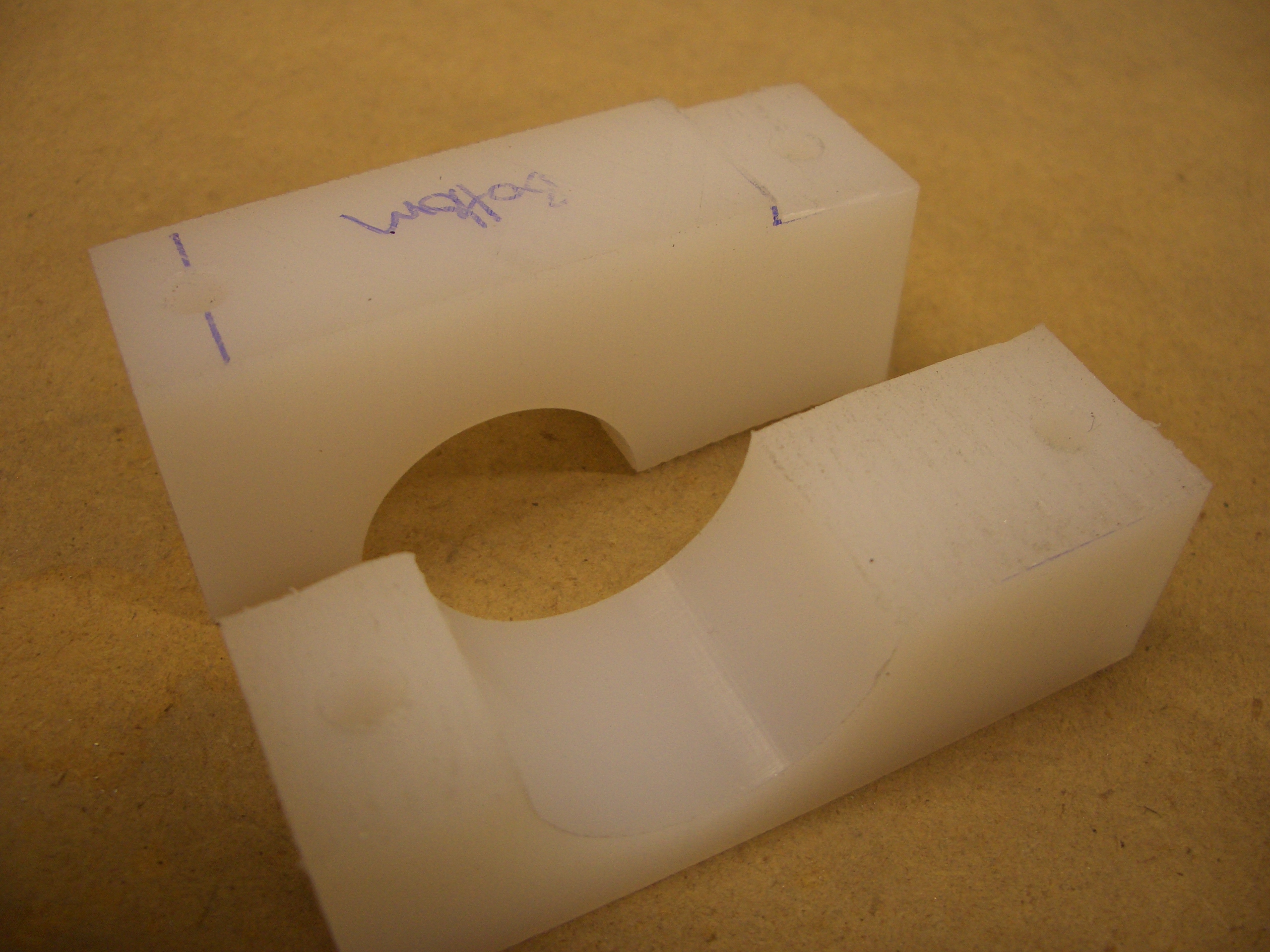 The center flap bearing block needs to be notched to fit over the seat pans and cut in half so that it can be installed around the flap weldment.