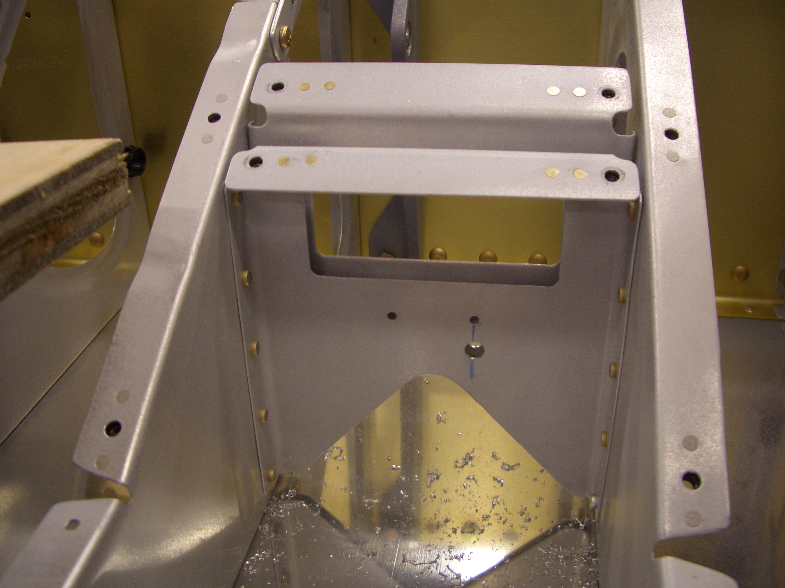 I have been trying to decide between the Hookers at $410/seat (with the rotary latch) and the Crow at $160/seat for quite some time. Safety wise, I think they’re comparable, but there are several drawbacks with the Crows. There are only four colors of webbing to chose from as well as four colors of pads to chose from, none of which match my interior very closely. Also, the rotary latch is quite thick and I’m worried that it will interfere with the stick. The Hookers come in 14 colors, with 20 color choices for pads and trim, and the rotary latch is much thinner. The only drawback is the price. What finally clinched it for me is that I found out that Classic Aero Designs (who will be making my interior) sells the Hookers and will make matching leather pads using the same material that my seats are made of. With that decision made, I went ahead and drilled/reamed a 1/4″ hole, 1/2″ below the outer holes in each crotch strap bracket. I can’t use the stock Van’s hole position because the Hooker brackets are longer than the Van’s brackets.