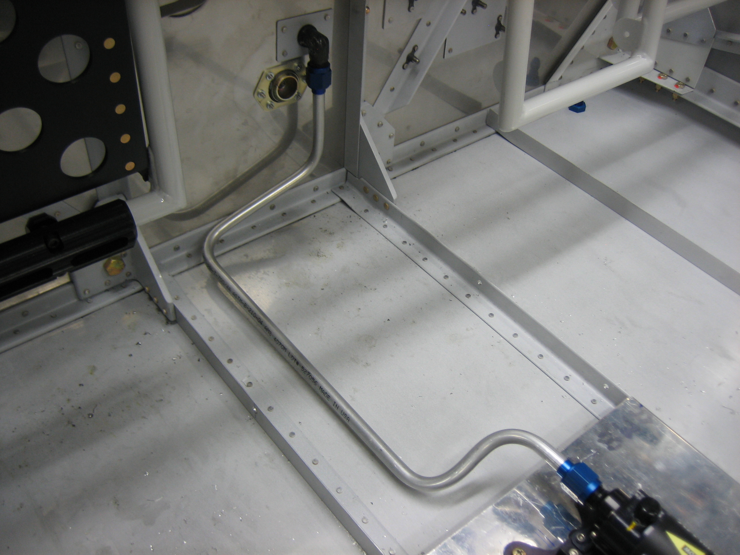 I ran the line on the left side of the bay since a large bundle of wires from the panel will enter this area just to the right of the firewall fitting and snake down under the forward cover and then under the aft cover. Keeping the line to the left gives me a little more room to run these wires.