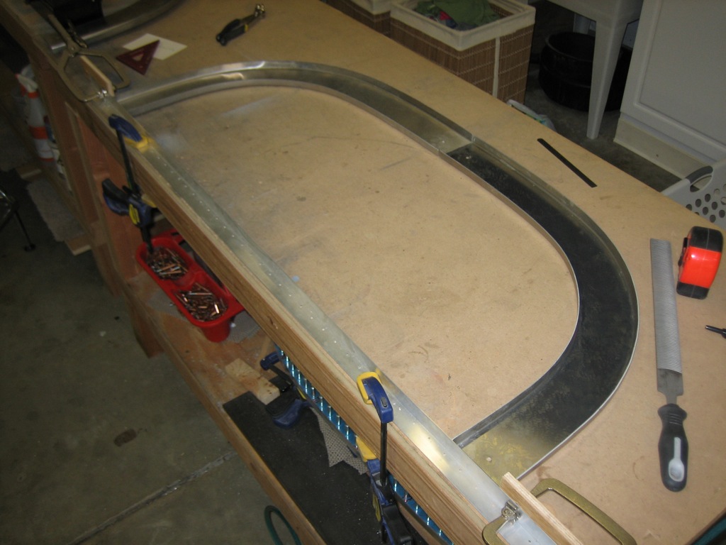 Since I’m waiting on an order from Aircraft Spruce for new 5052 brake lines, I decided to get started on the cabin frame. I clamped a straight edge to the bench and then clamped wooden blocks to the vertical legs to define the overall width of the frame.