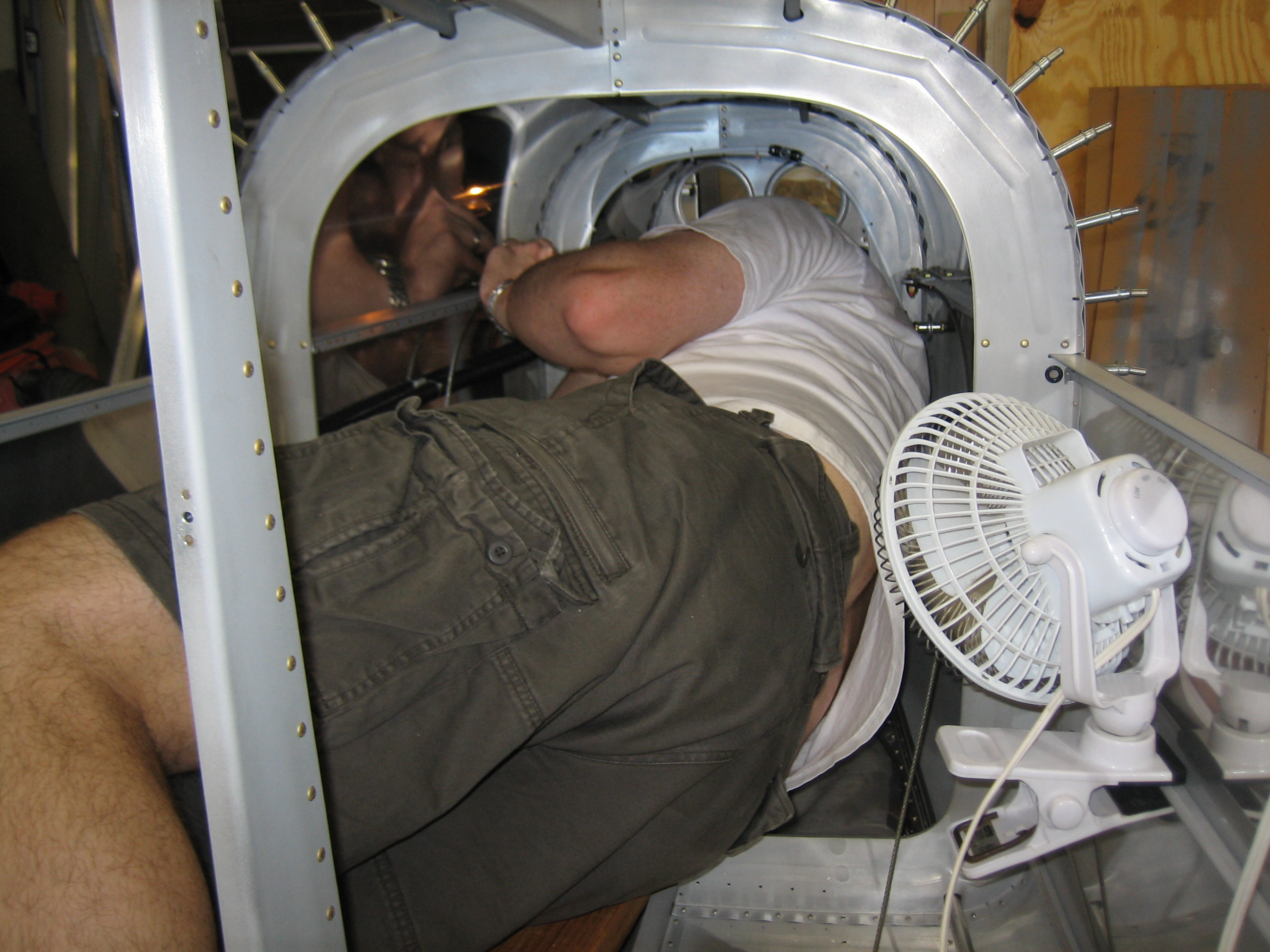 My buddy Andre came over today to help me rivet the aft top skin. I got the honors of crawling into the tailcone to buck these rivets. I’m a pretty big guy (6’4″ and 235 lbs), so this was a pretty tight fit and I was pretty uncomfortable by the end. After knocking out all of the riveting, I also torqued and sealed the shoulder harness attach strap bolts. I didn’t want to have to climb back in here again if I could help it.