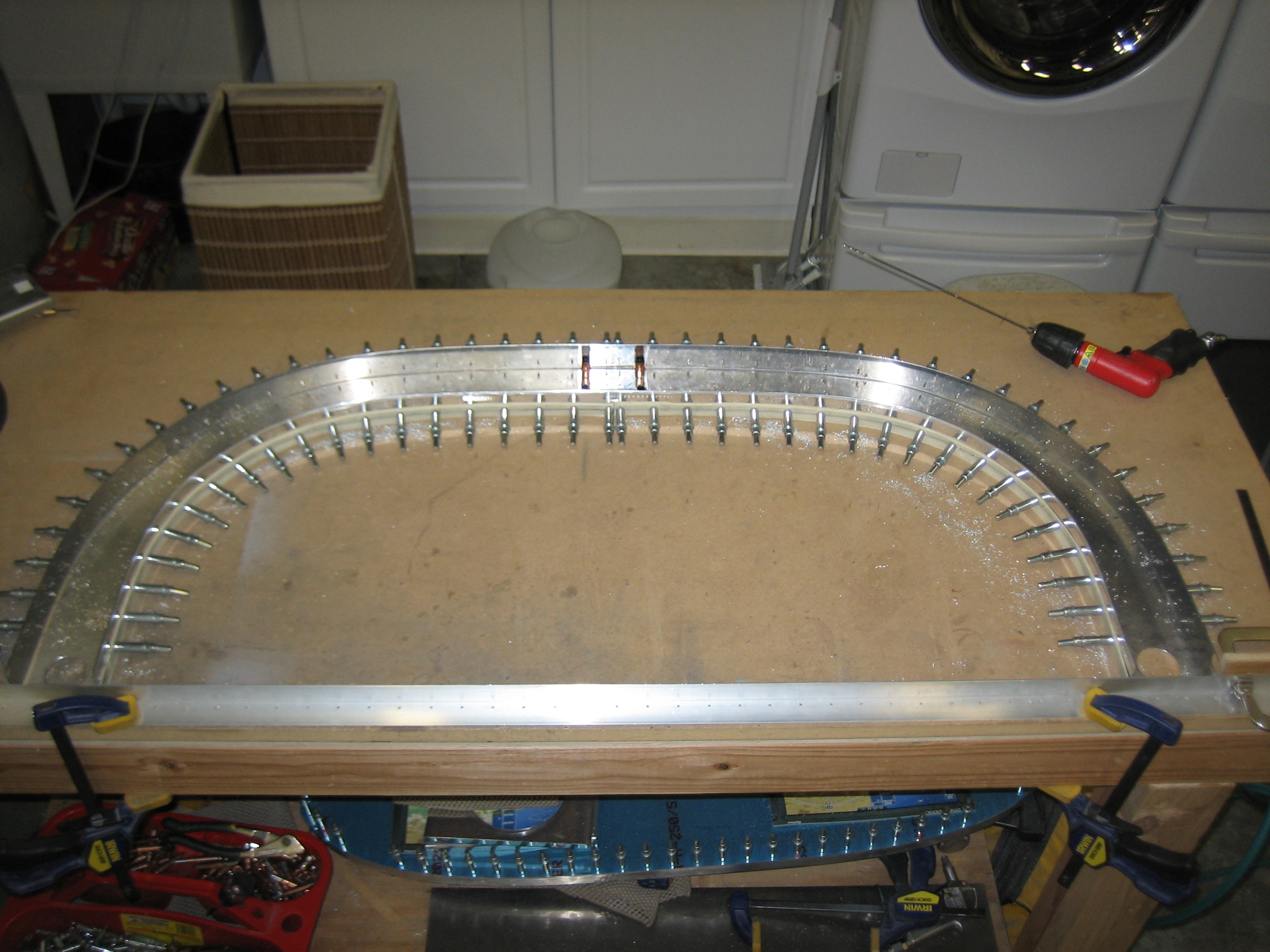 Later in the evening after everyone else had gone to bed, I drilled the outer cabin frame joint strip drilled to the aft channel. I need to make some spacers to temporarily fit between the forward and aft channels to ensure proper spacing.