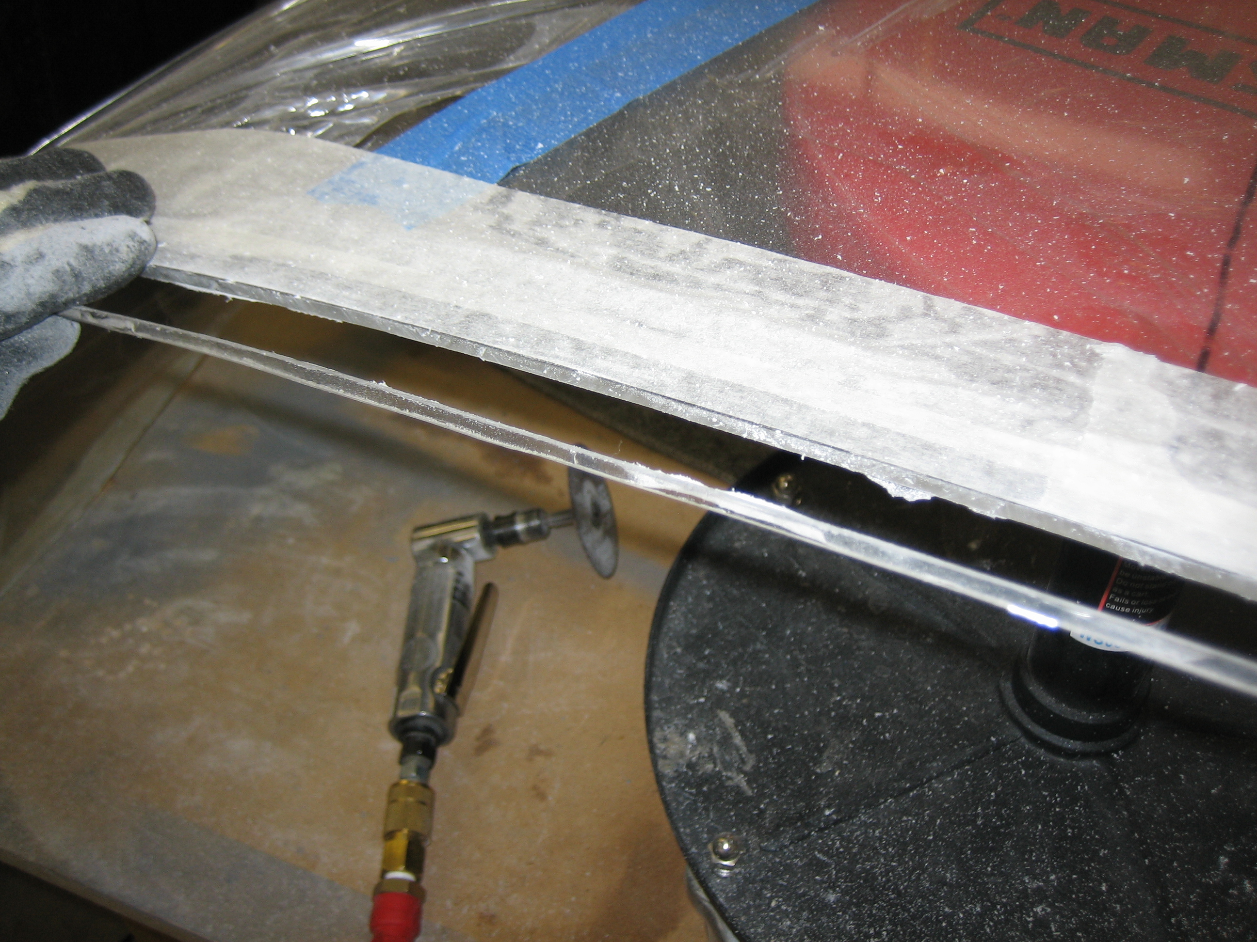 Now that the holes are drilled, I laid out a line 5/16″ behind the holes and trimmed the aft edge of the rear window as well. The cutting wheel is officially retired! There will be some minor fitting left to do, but I’ll do all of that with the belt sander.