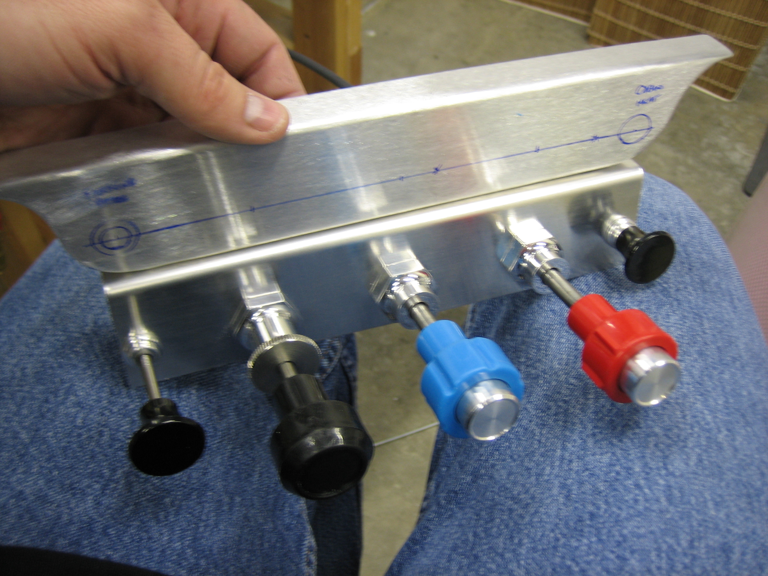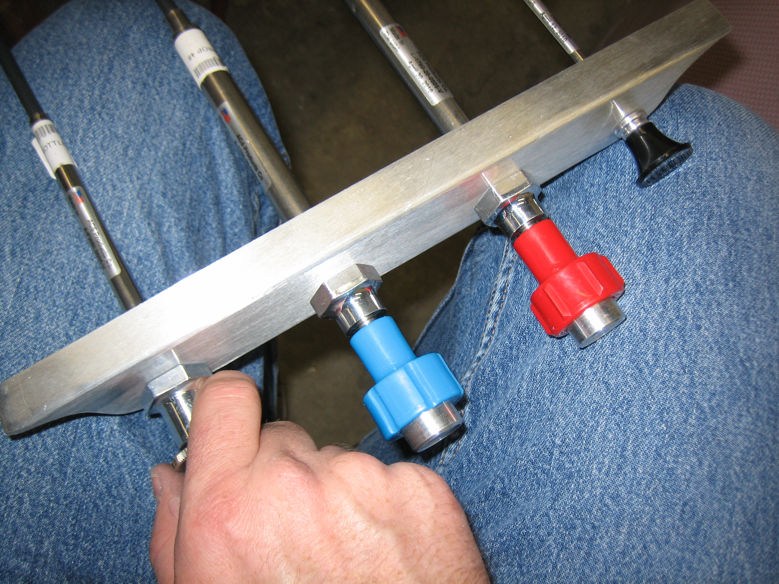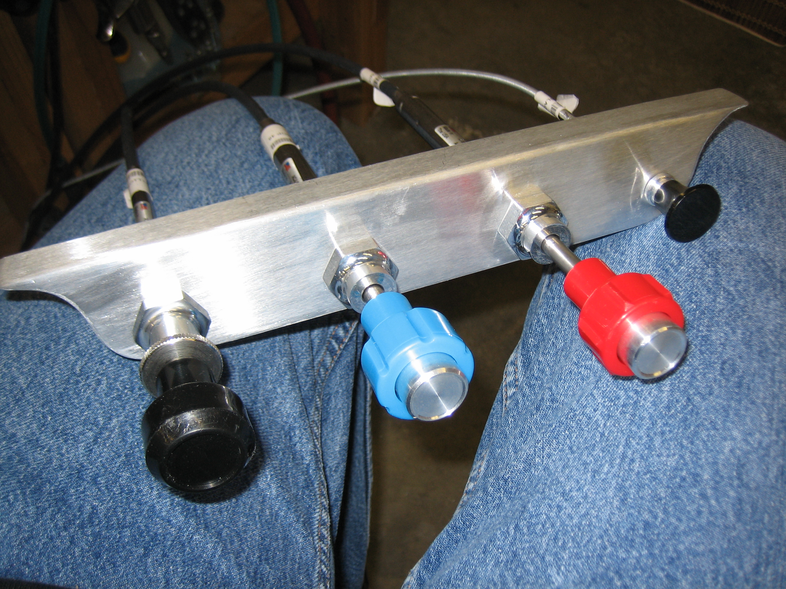 Anyway, tonight’s little project was to determine the mounting position for the control cables. I used the stock bracket that came with the kit to mock up a potential control spacing to see if there were any conflicts before drilling the actual bracket that I bought from Experimental Air. My original goal (and what I mocked up here) was to put the three engine controls in the center, the parking brake on the left and the cabin heat on the right. This resulted in 2″ between the outer knobs and the outboard engine controls and about 2 7/16″ between each of the engine controls. After playing with it for a few minutes, I decided that this was too tight and that the cabin heat knob should be removed from the bracket.