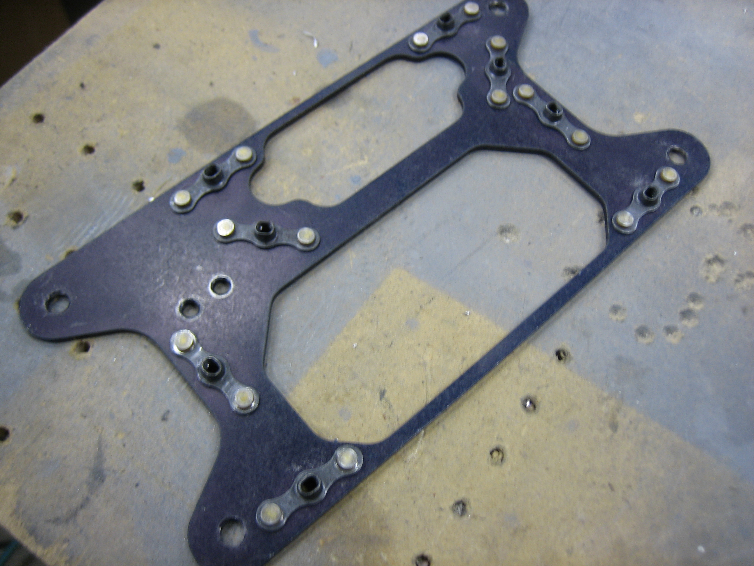 After fiddling around with where to mount the fuel pump, I decided not to mount the fuel pump to cross bars on the center cover.  I did this for a couple of reasons.  First, It means that the fuel pump has to come out if I ever need to remove the cover fiddle with the wiring.  Second, the cross bars reduce the vertical space available for wiring under the cover.  Instead, I’m going to mount the fuel pump mounting plate directly to the floor.  I do need to be able to remove the fuel pump and controller if they ever need to be serviced, and I don’t want to have to remove the mounting plate since that will require two people (one for the screws on the outside and one for the nuts on the inside).  To do that, I decided to replace all of the small metric nuts and screws with standard #6 AN hardware.  I installed nutplates on the bottom of the mounting plate.