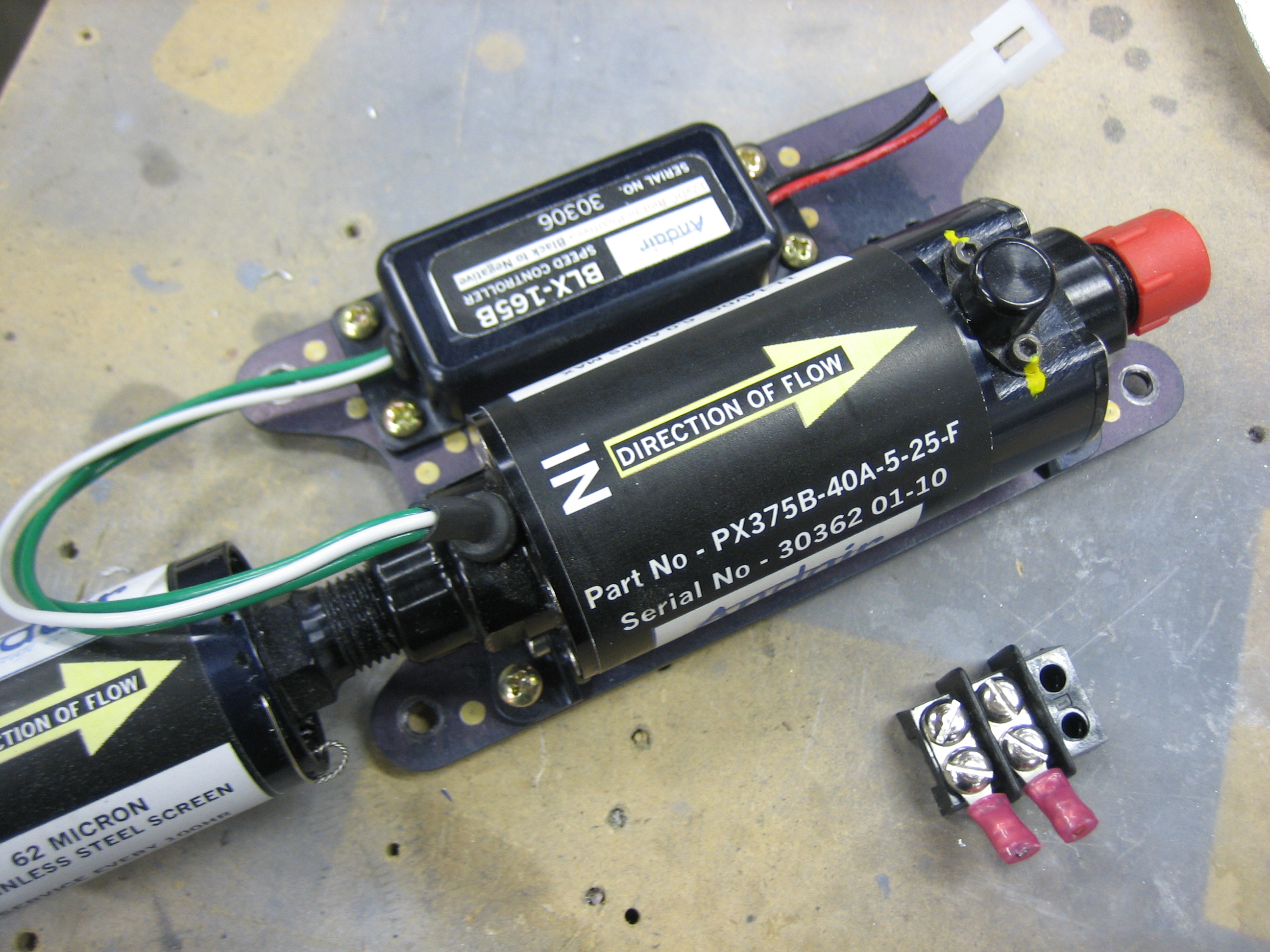 I then used some short AN515 #6 screws to screw the pump and controller down to the mounting plate.  You can also see that I removed the terminal block and replaced it with a two connector molex connector.