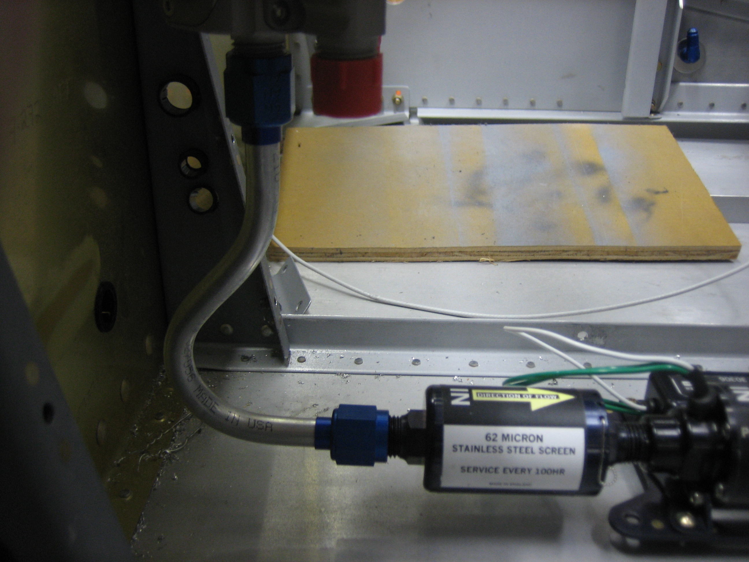 Moving the pump down made it a lot easier to bend this fuel line between the fuel selector and the fuel filter.  There is tons of room around the fuel line, and plenty of clearance from the spar penetration holes for wiring.  This also brings the pump pretty far back which keeps it completely inside the pump cover.