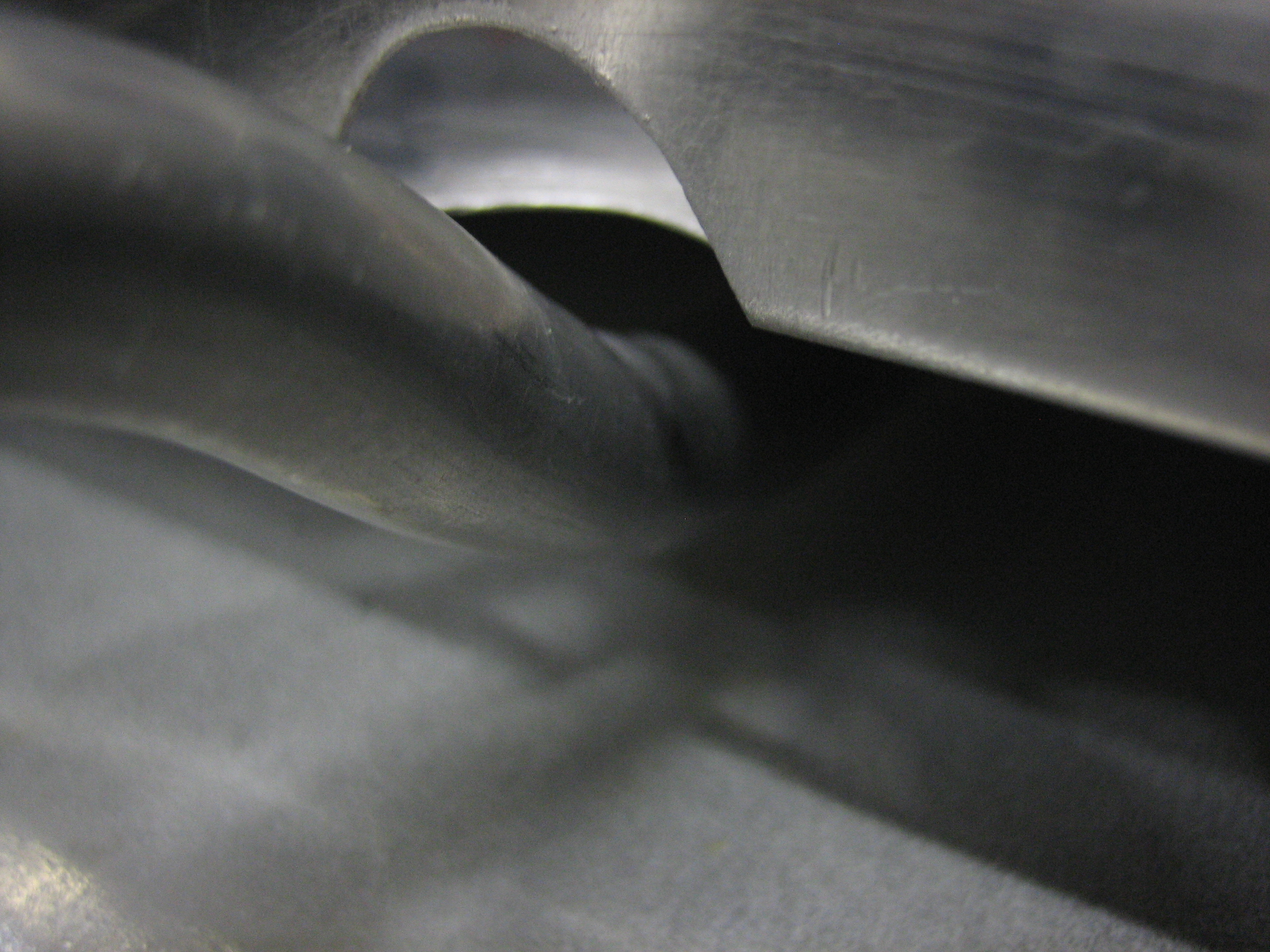 The line just touched the forward end of the cutout, so I used my Dremel and sanded away a relief.  There is about 1/4″ of clearance around the line now and nothing can flex that far.  I might still add some silicone wrap here though.