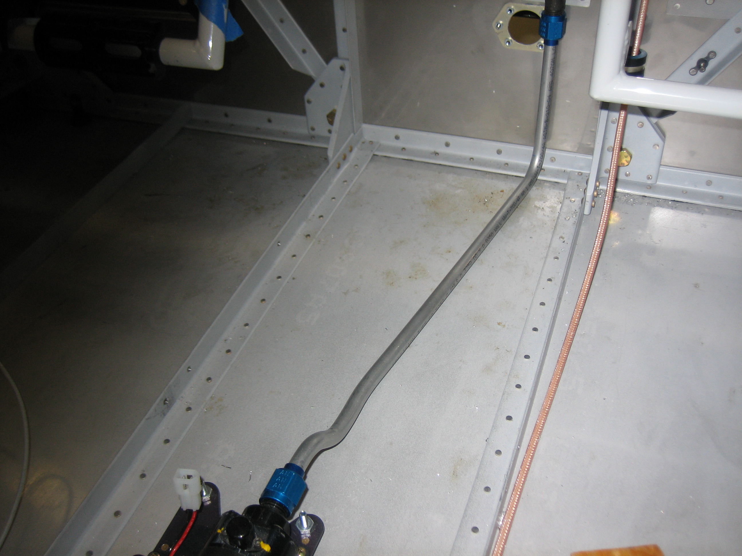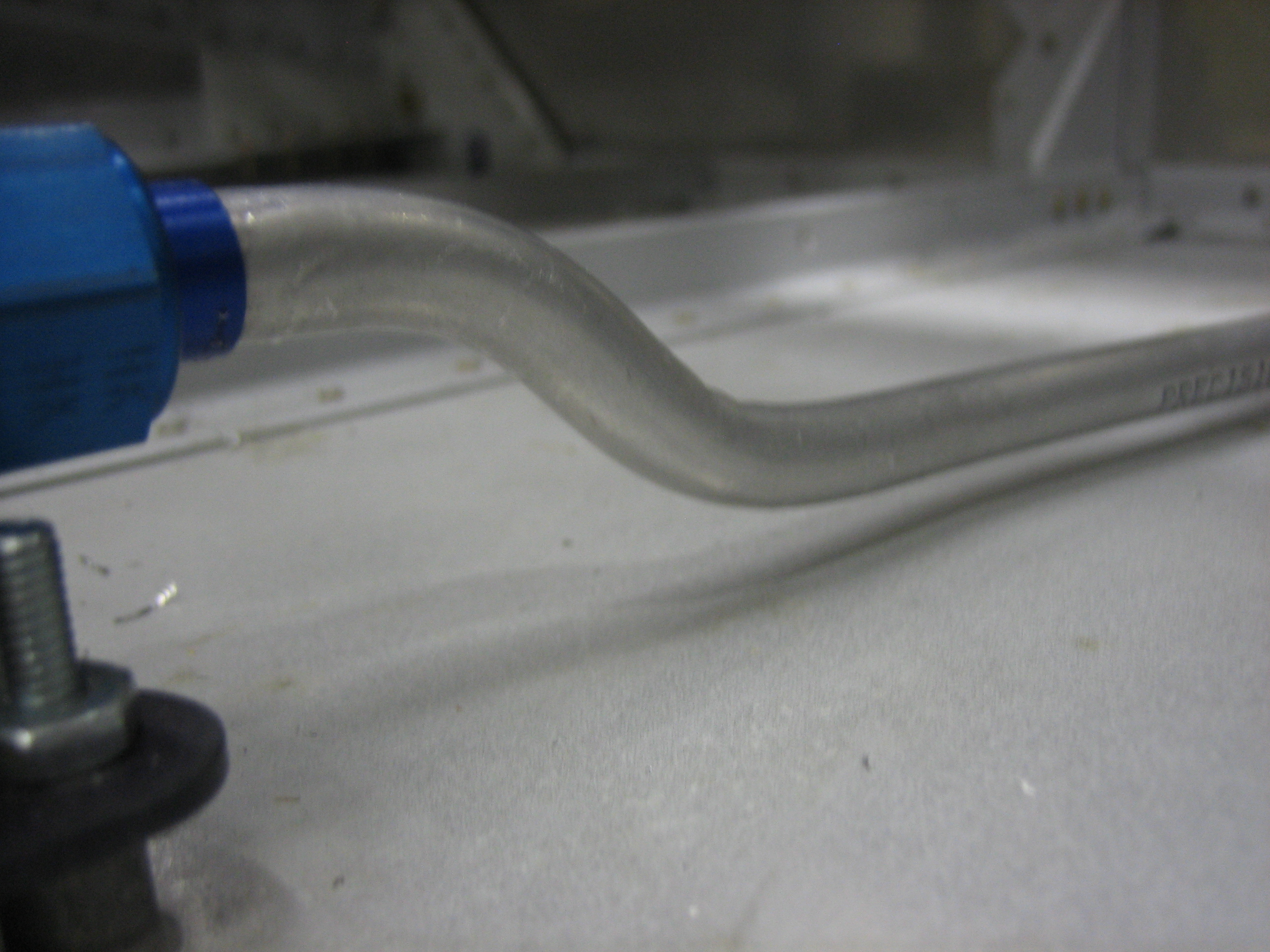 The line steps down immediately after leaving the pump to go under the cover and then bends slightly to the right to head directly to the firewall penetration.