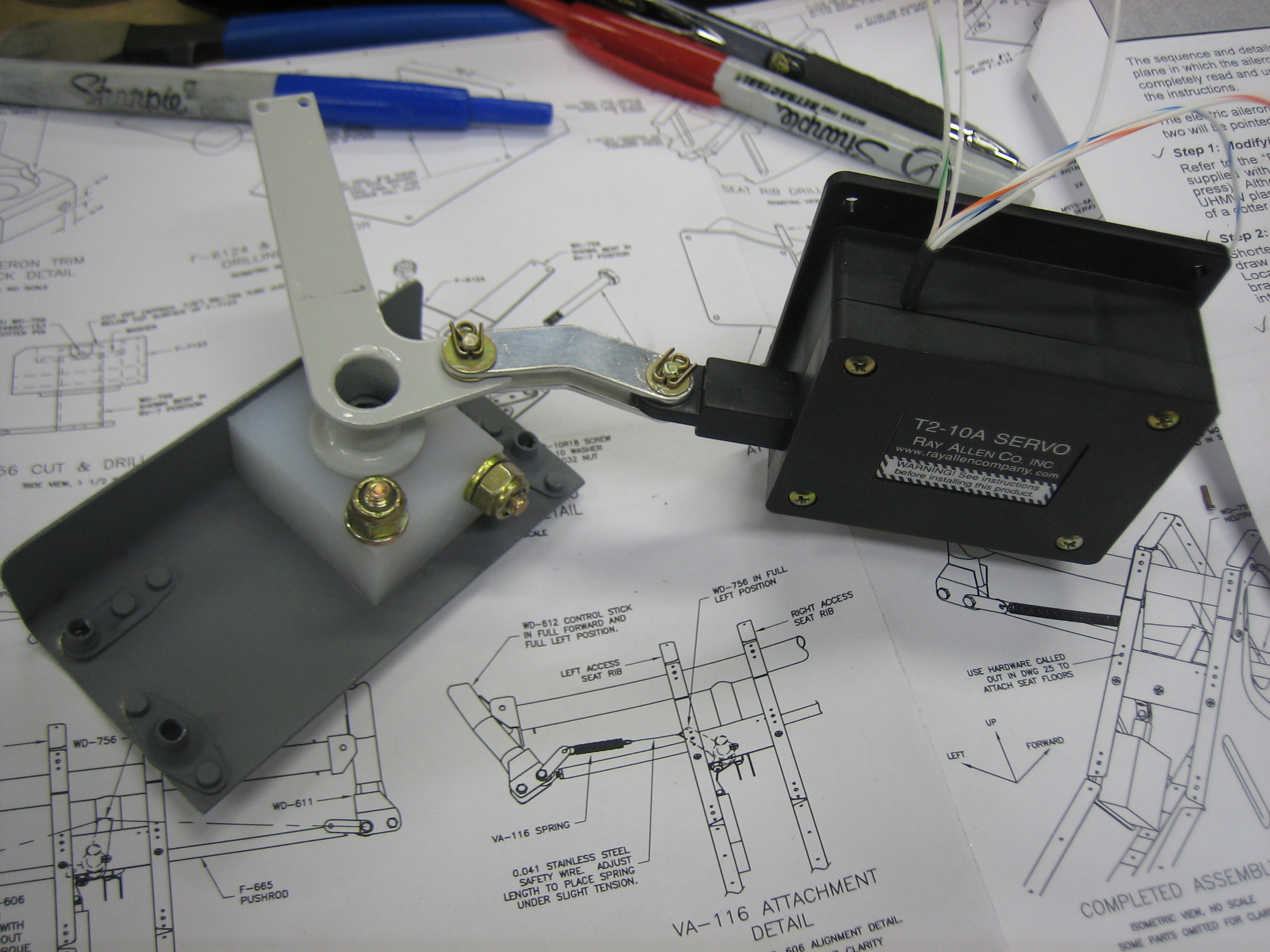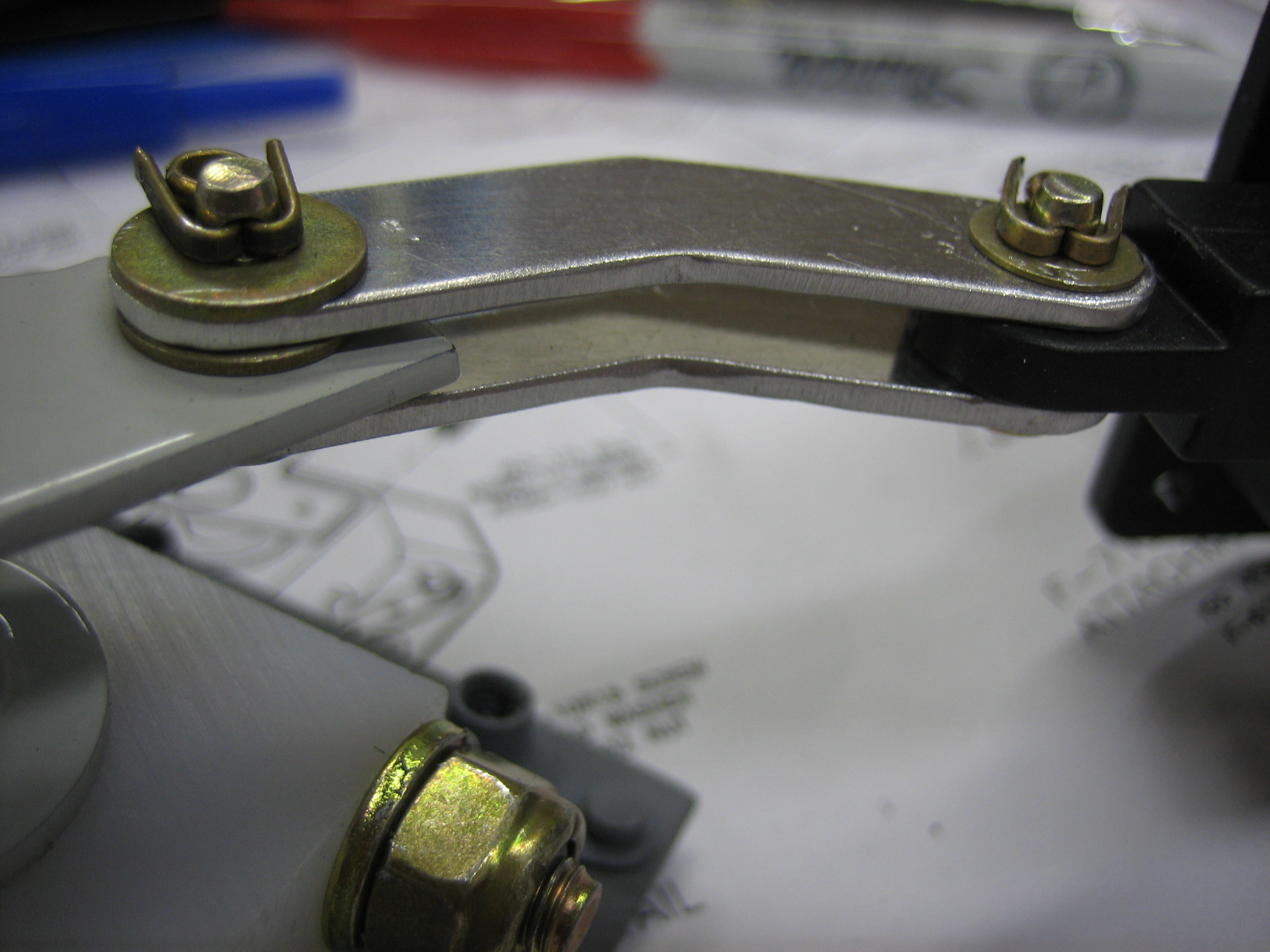 Here’s the whole mechanism assembled.  The servo pushes on the bracket and will turn it around the shaft.  Spring linkages will connect the other bracket arm to the control sticks to bias the neutral point.