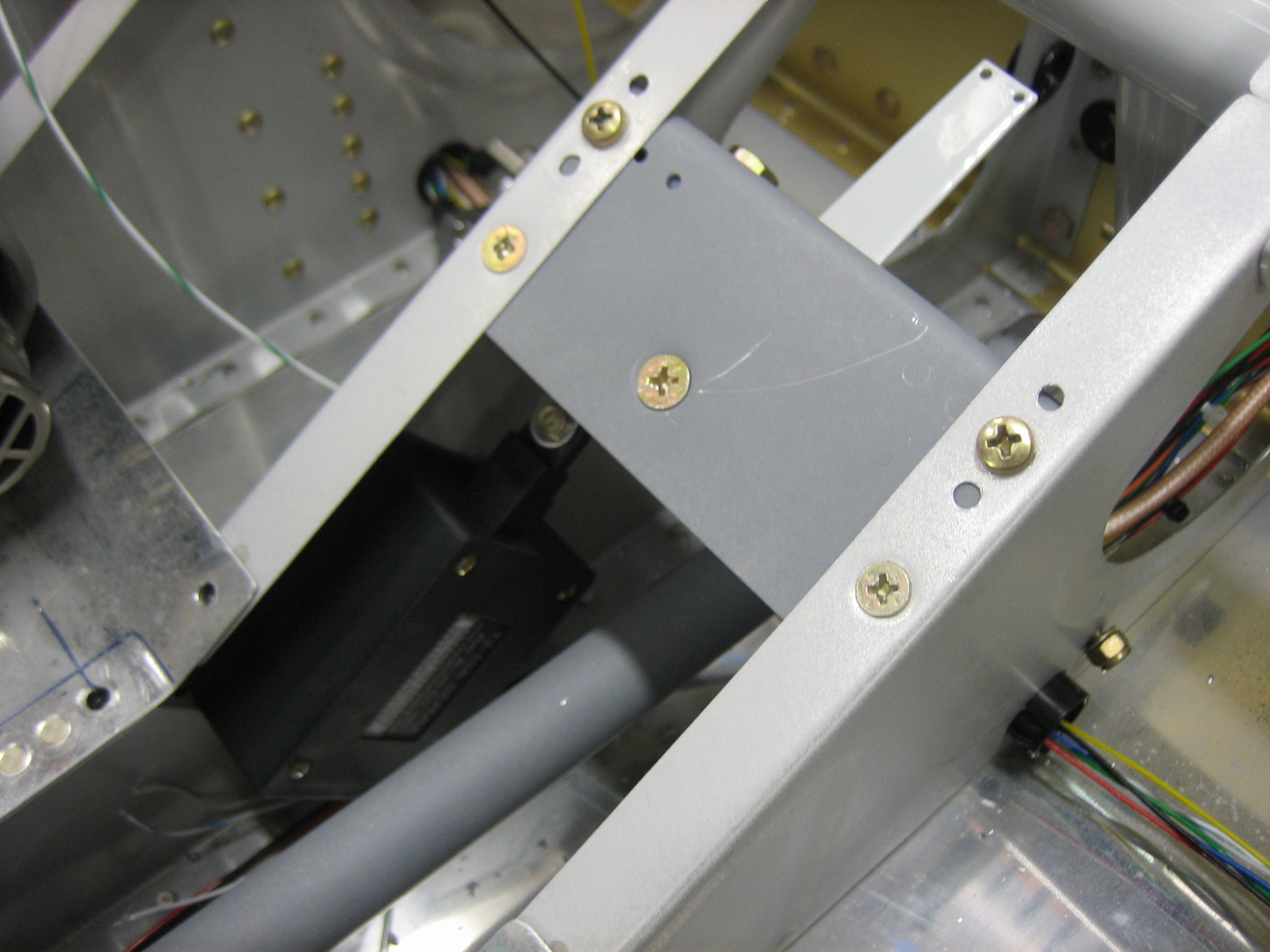 Finally, I mounted the bracket between the seat ribs.  I had to remove the elevator pushrod to get the angle drill in here to drill the servo to the skin.