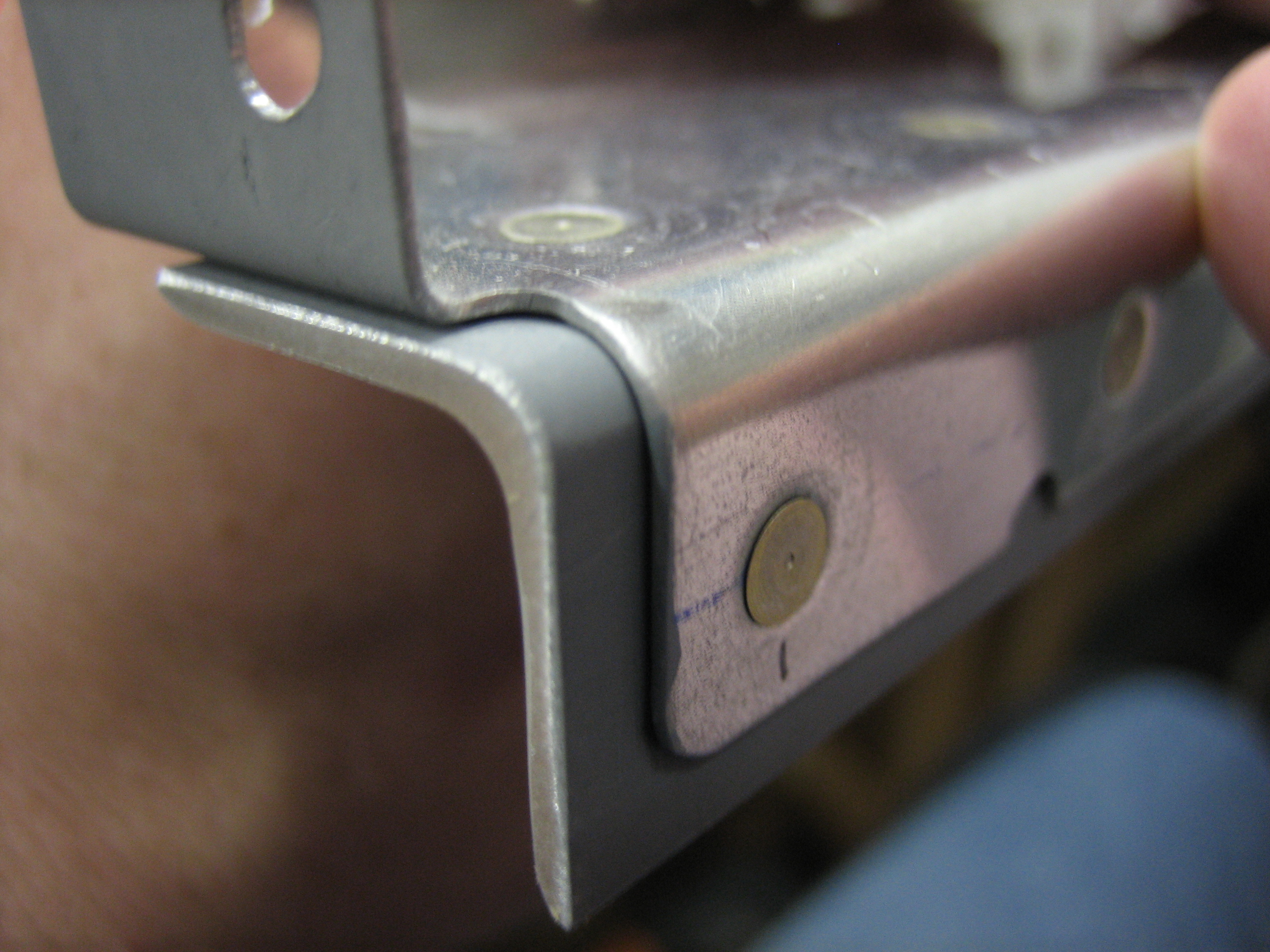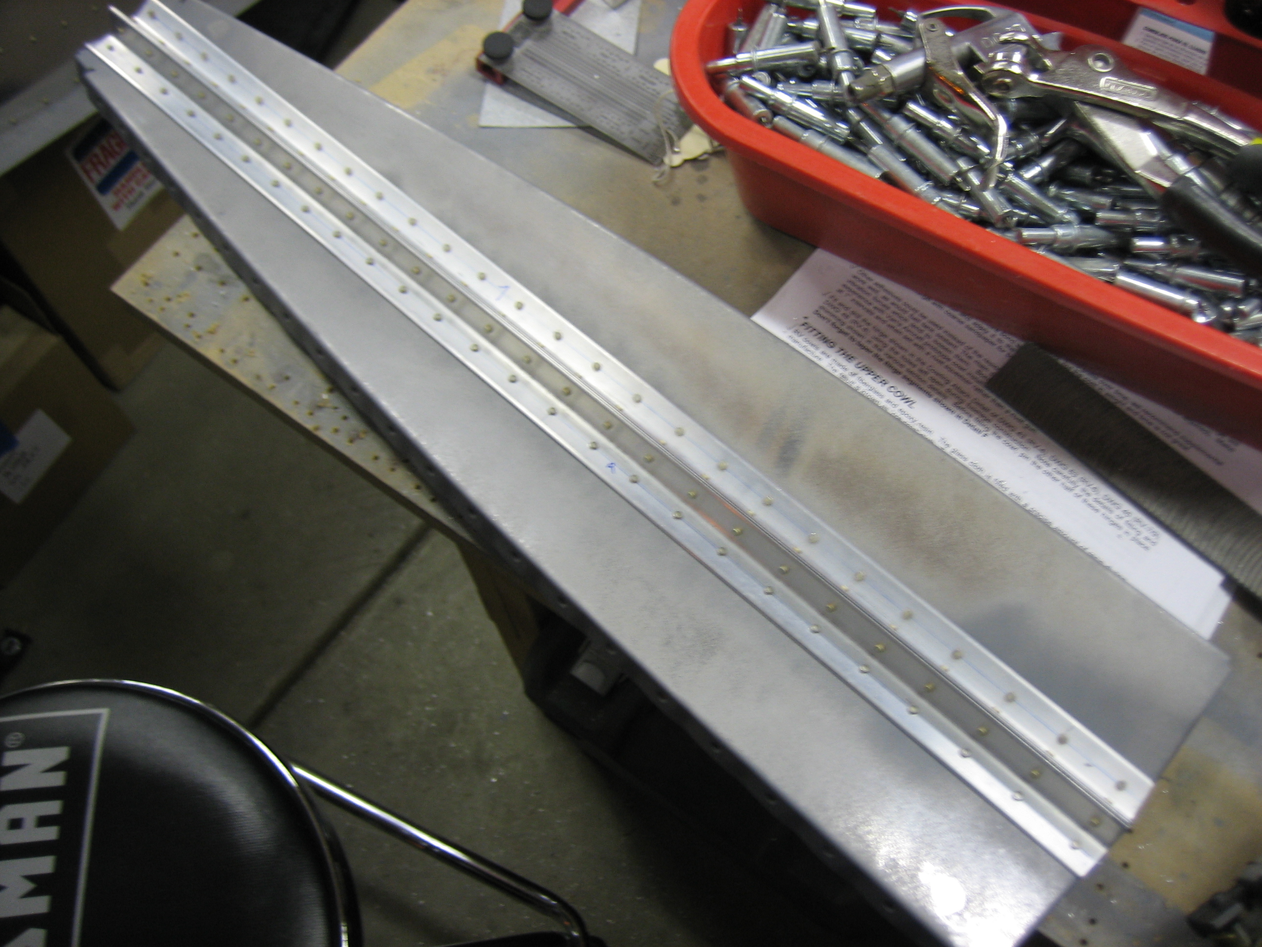 I countersunk the reinforcement angles and dimpled the armrests. After edge finishing the armrests, I primed and riveted the parts together.