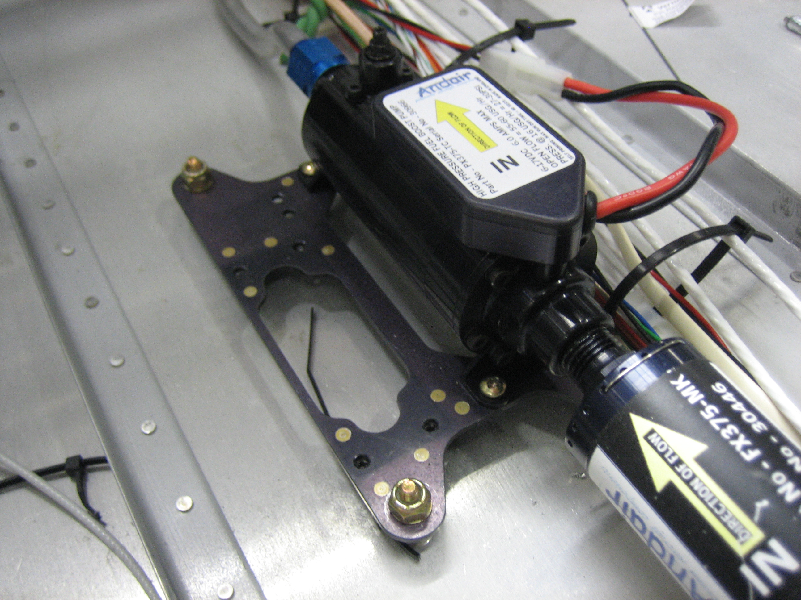 Andair recently posted that they had updated their fuel pump design and offered a free upgrade for anyone that had purchased one of the older designs. Mine arrived today and I quickly installed it. The controller is now integrated, so that leaves an empty spot next to the pump on the mounting bracket. I don’t think I’ll mount anything here though.