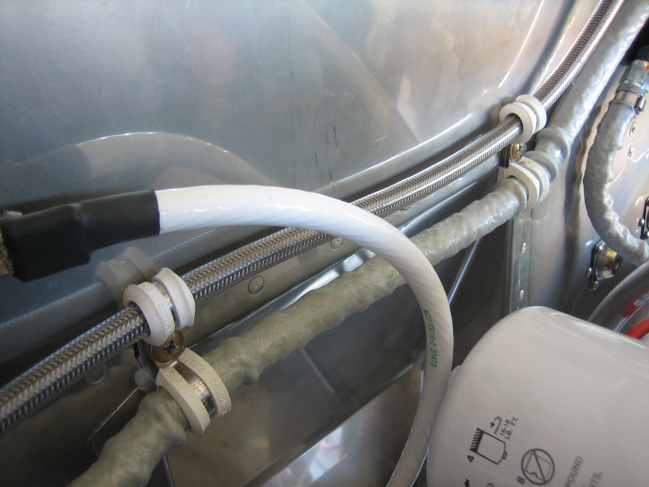Fastened Hoses to Firewall Leave a comment June 24, 2011 jason Now that the firewall sealant has cured, I fastened the manifold pressure and oil pressure lines to the firewall at two points.
