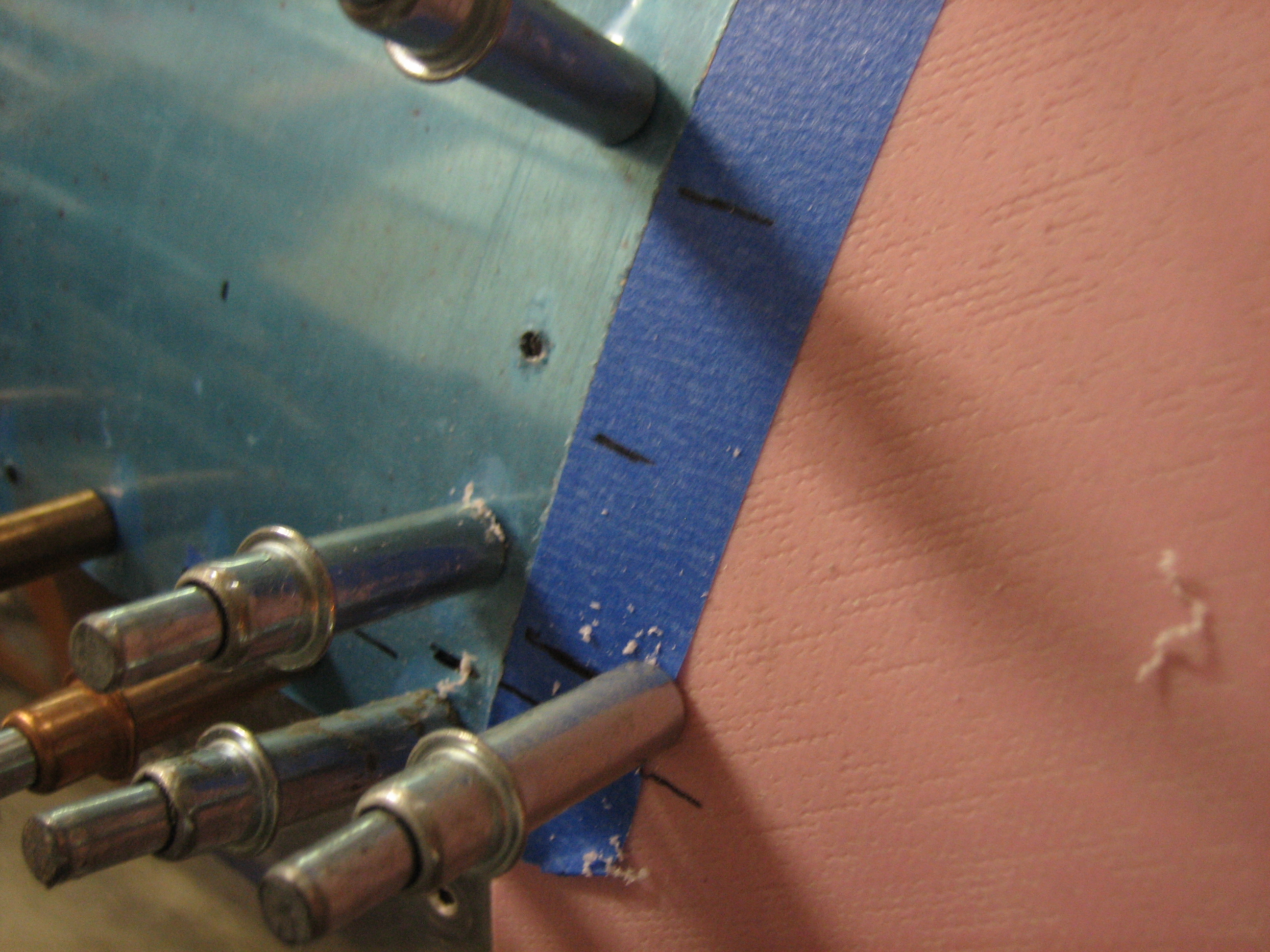 After a little more trimming of the aft end of the upper cowl, I strapped it down and laid out holes on approximately 1″ spacing for drilling the cowl to the hinge. I then drilled one hole on each end of the hinge and one in the middle to lock the upper cowl into its final position.