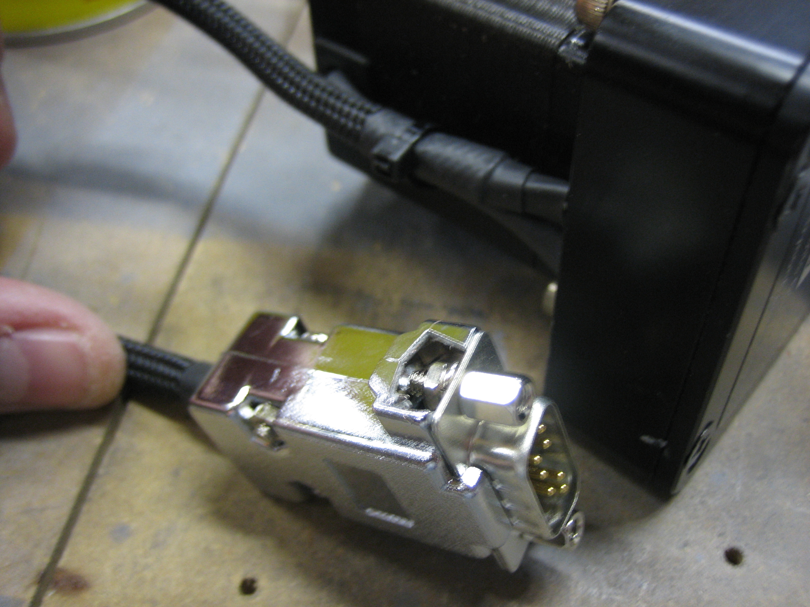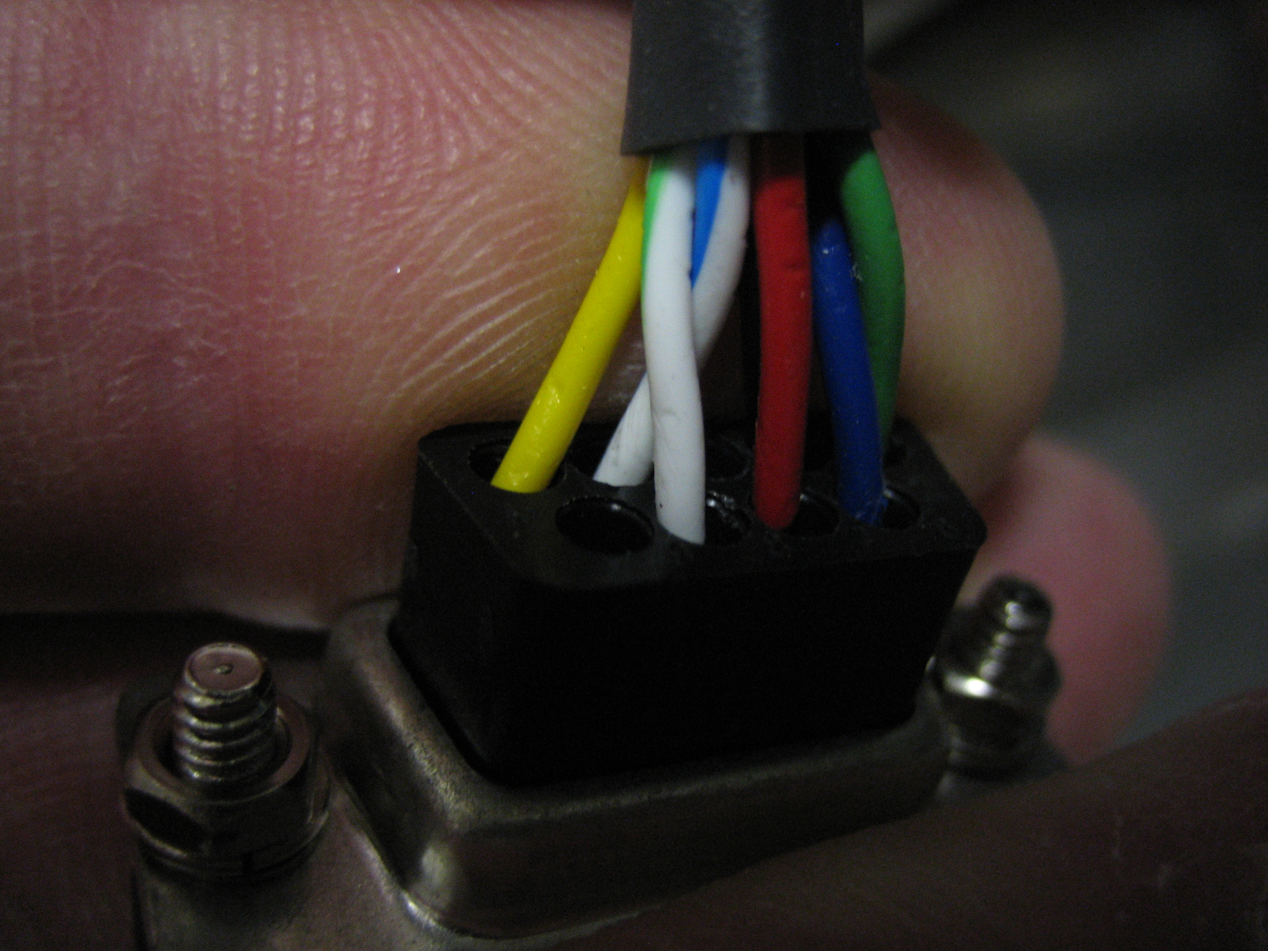 I installed a male DB-9 connector on the end of the wires from the roll servo. I took this picture mostly to document the wire positions in the connector. Not easily visible is the black wire that is connected to pin #2 (straight behind the red wire and just to the left of the green wire).