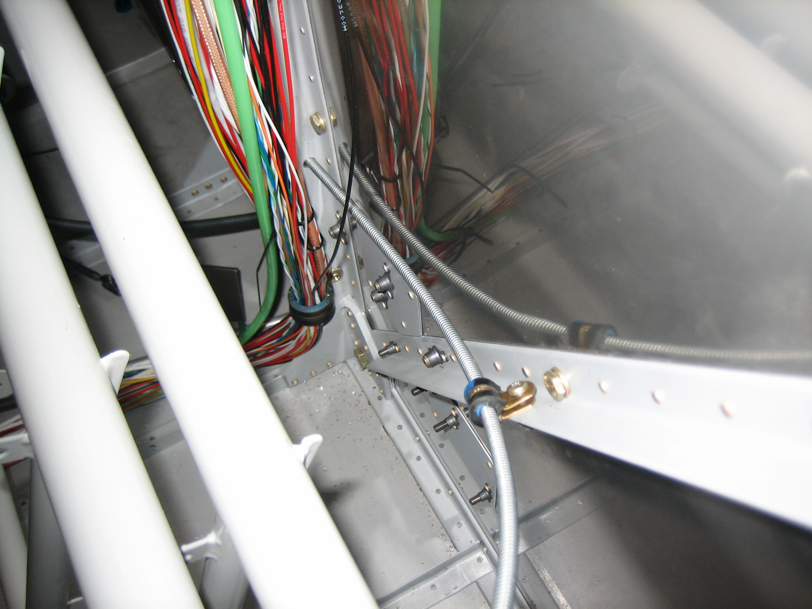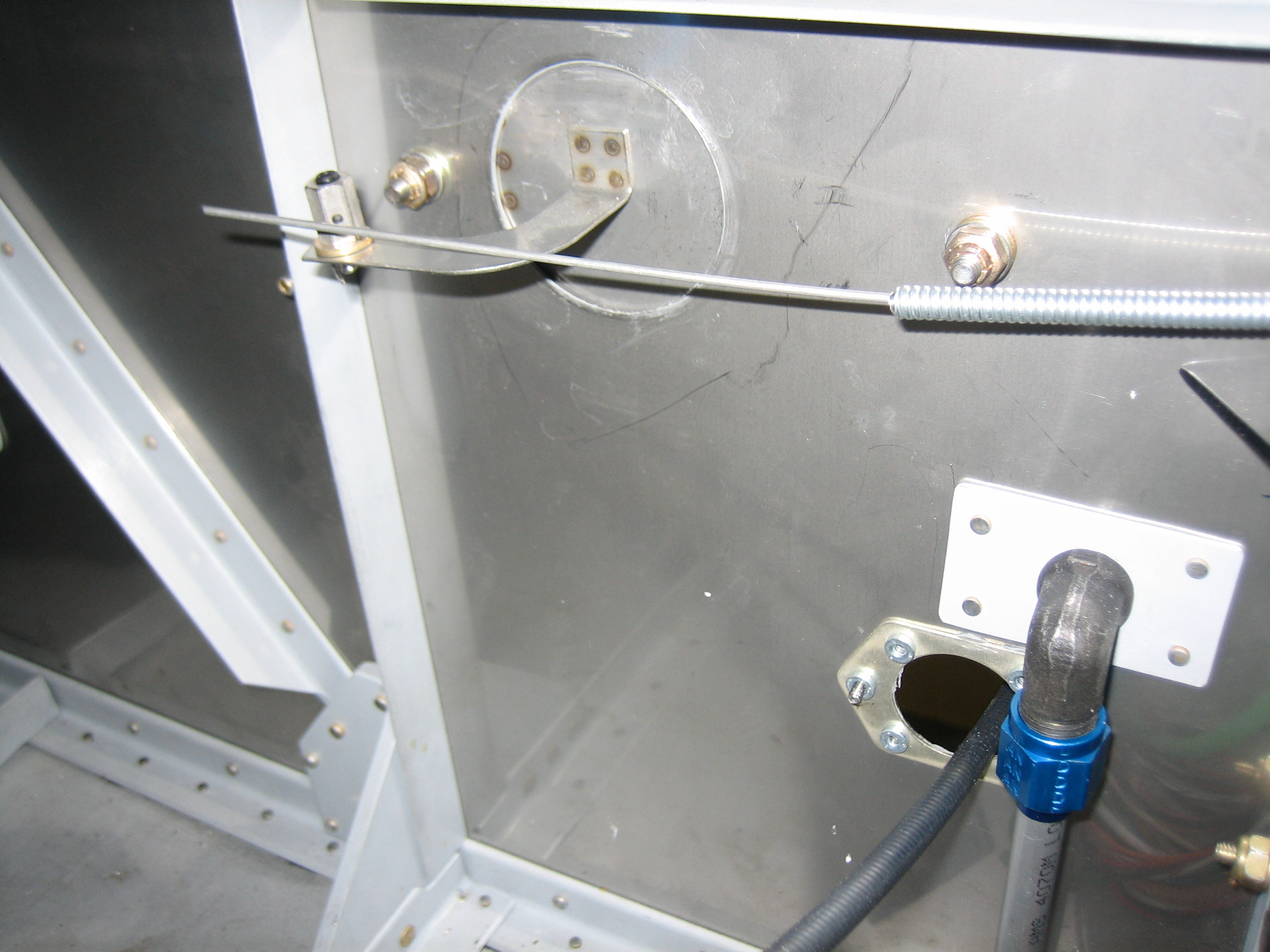 The housing will be anchored with another adel clamp to the bolt on the right and the protruding wire will attach to the b-nut on the flapper arm. There’s no point hooking these up now since the control cable has to be removed when the instrument panel comes out for paint and labeling.