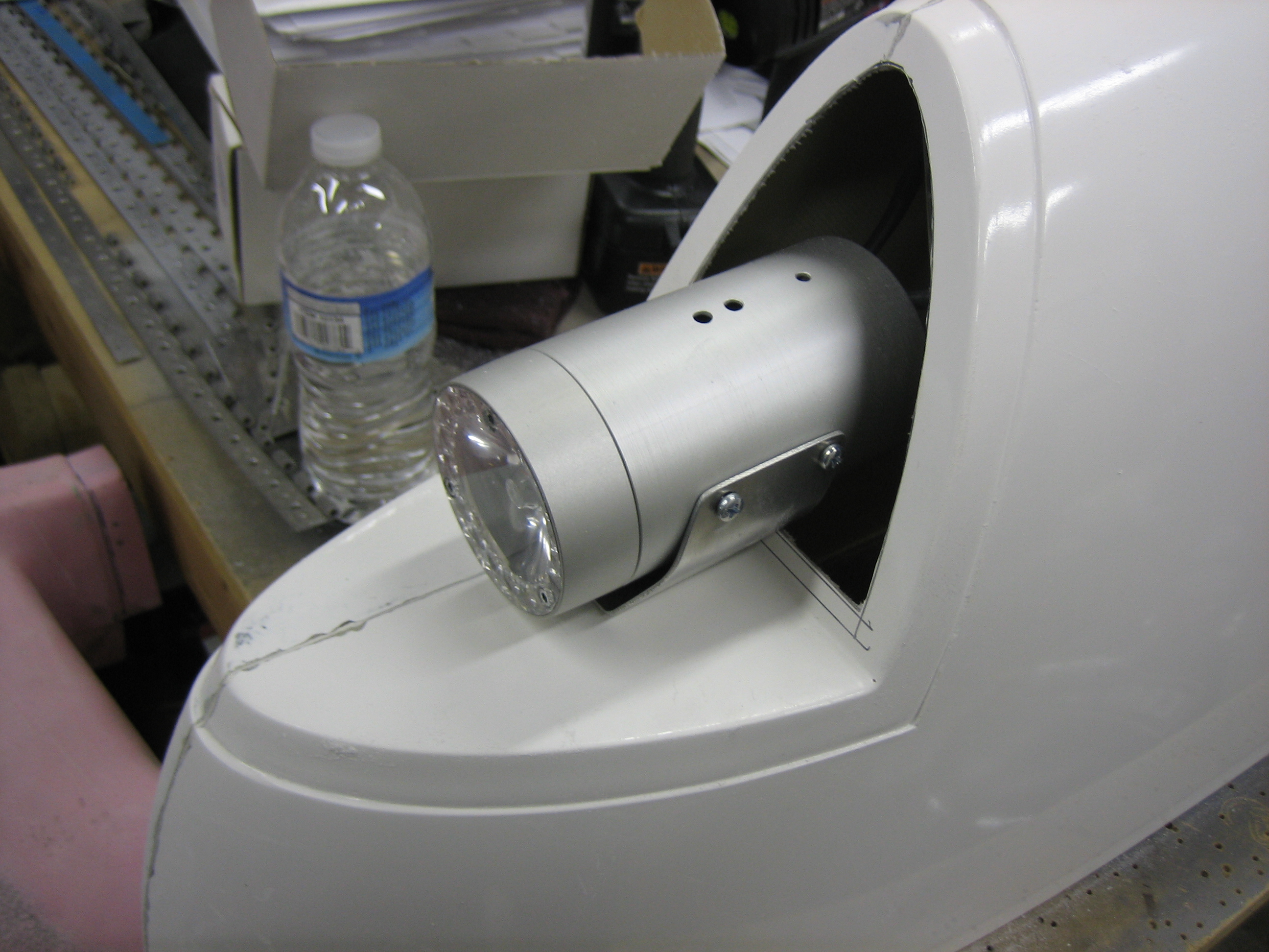 I started working on the wingtip lights tonight.  I’m going to fabricate a reflective backing for both sides of the recess, so I was fairly generous with the cutout so that I can easily position the light.  I’ll trim the backing to tightly follow the lights.  I don’t want to determine the final position until the nav/strobe light is attached and the lens cover is trimmed so that I can make sure there is no interference.  This is approximately where the light will end up though.  The is substantially farther forward than the stock lights which should provide better lighting directly in front of the plane.  The stock light position puts the bulbs a good 4″ farther aft which causes the side of the recess to shade the area directly in front of the plane.
