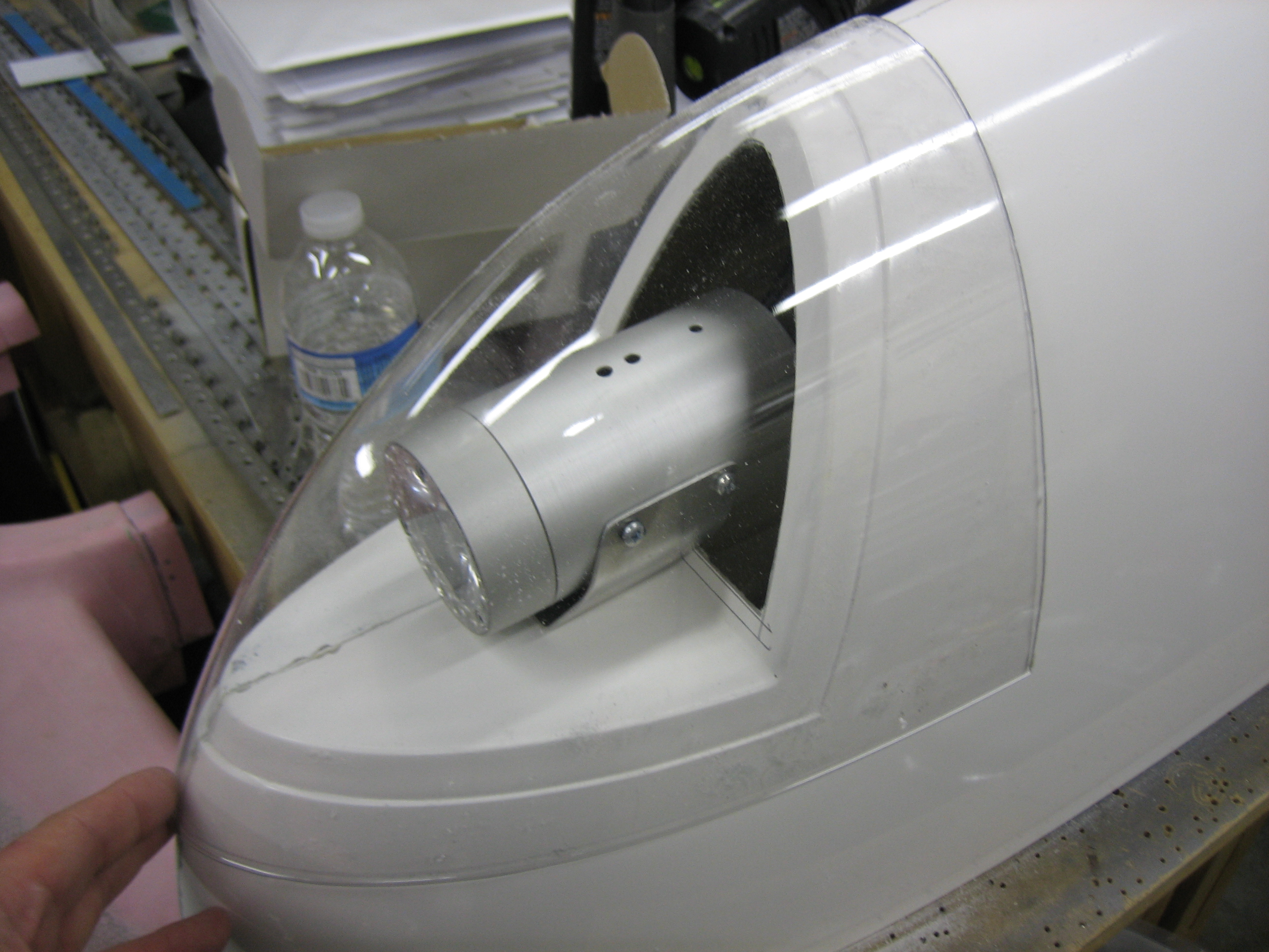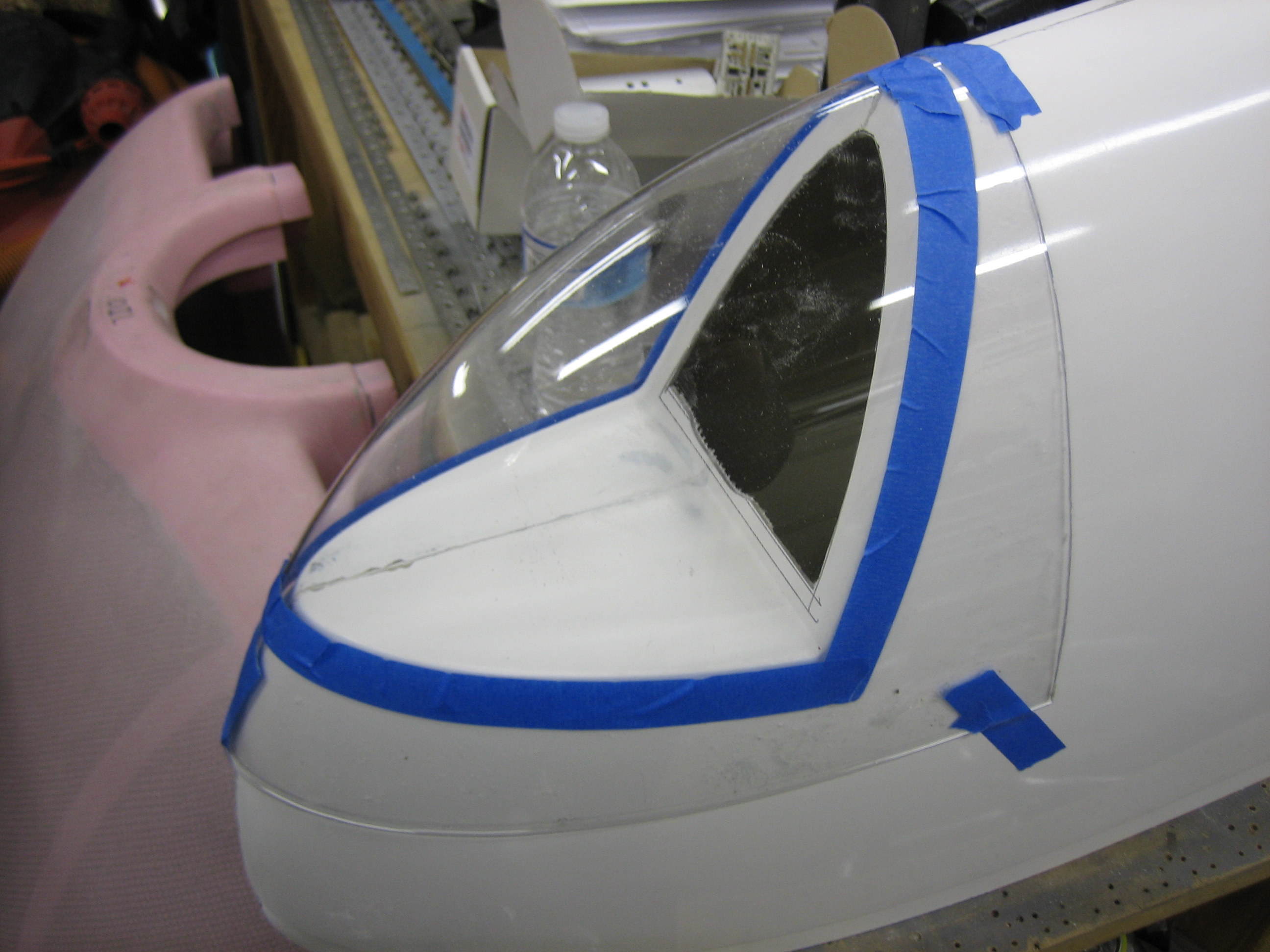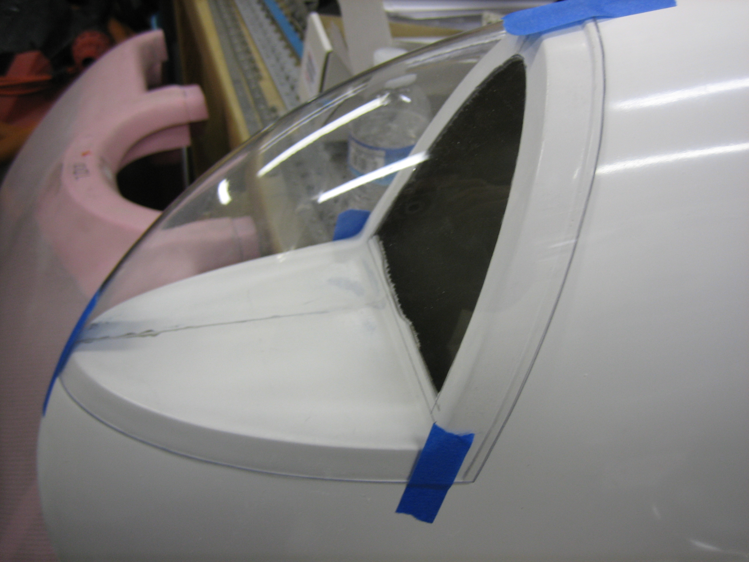 I adjusted the lens until it looked like it would precisely follow the curvature of the outer edge of the wingtip and then taped it down.  I used some masking tape to mark the cut line.  The lens will pull back farther after it’s cut, so this will just be a preliminary cut line.