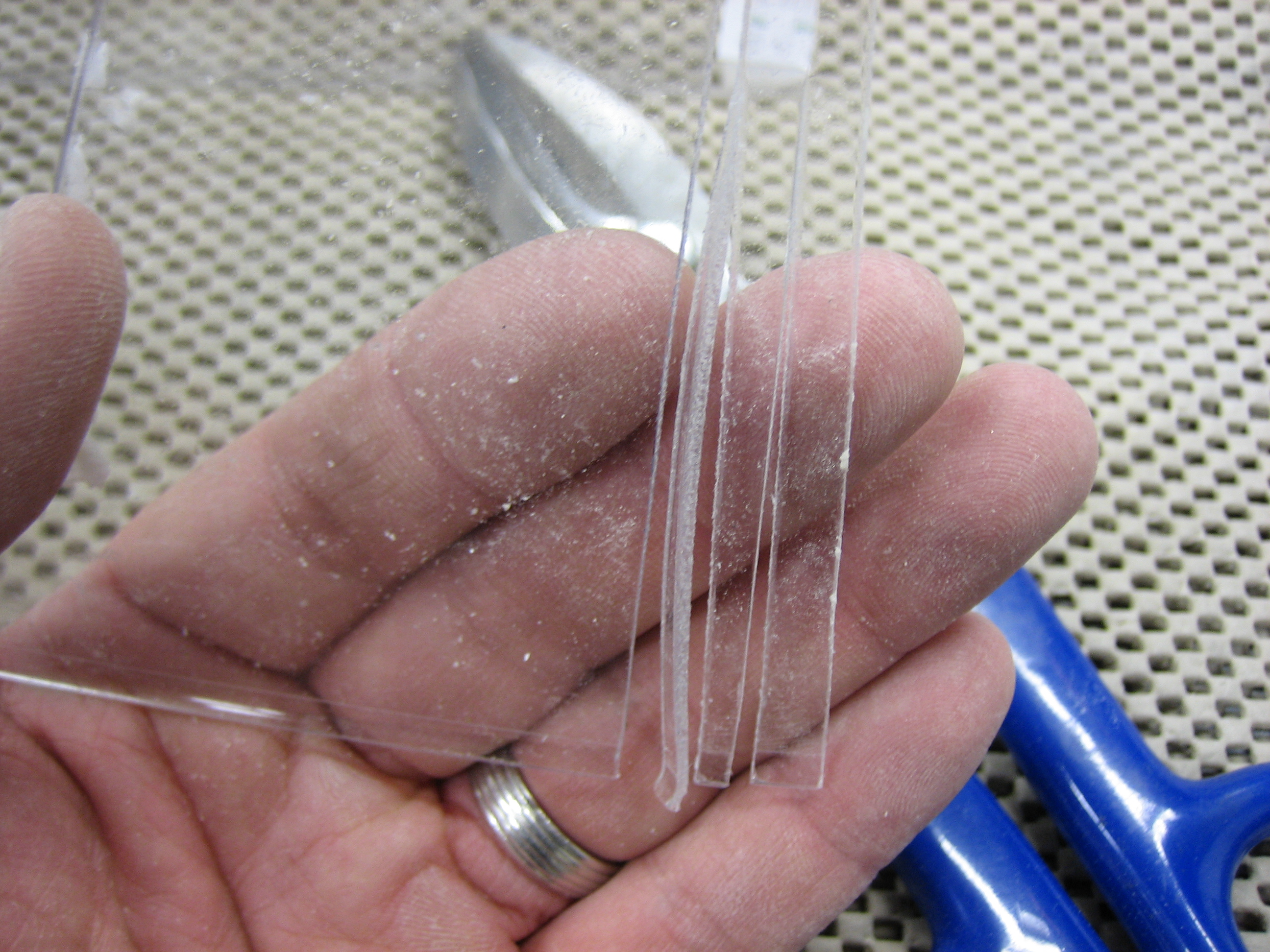 I played with some tin snips along the edge, and they made perfect cuts without any hint of cracking the plastic, so I used them to cut out the lens.  This was far better than using the cutoff wheel since I could basically trim right to the line and then touch up the edge with some sandpaper to remove any microscopic burrs that could create stress risers and lead to cracks down the road.