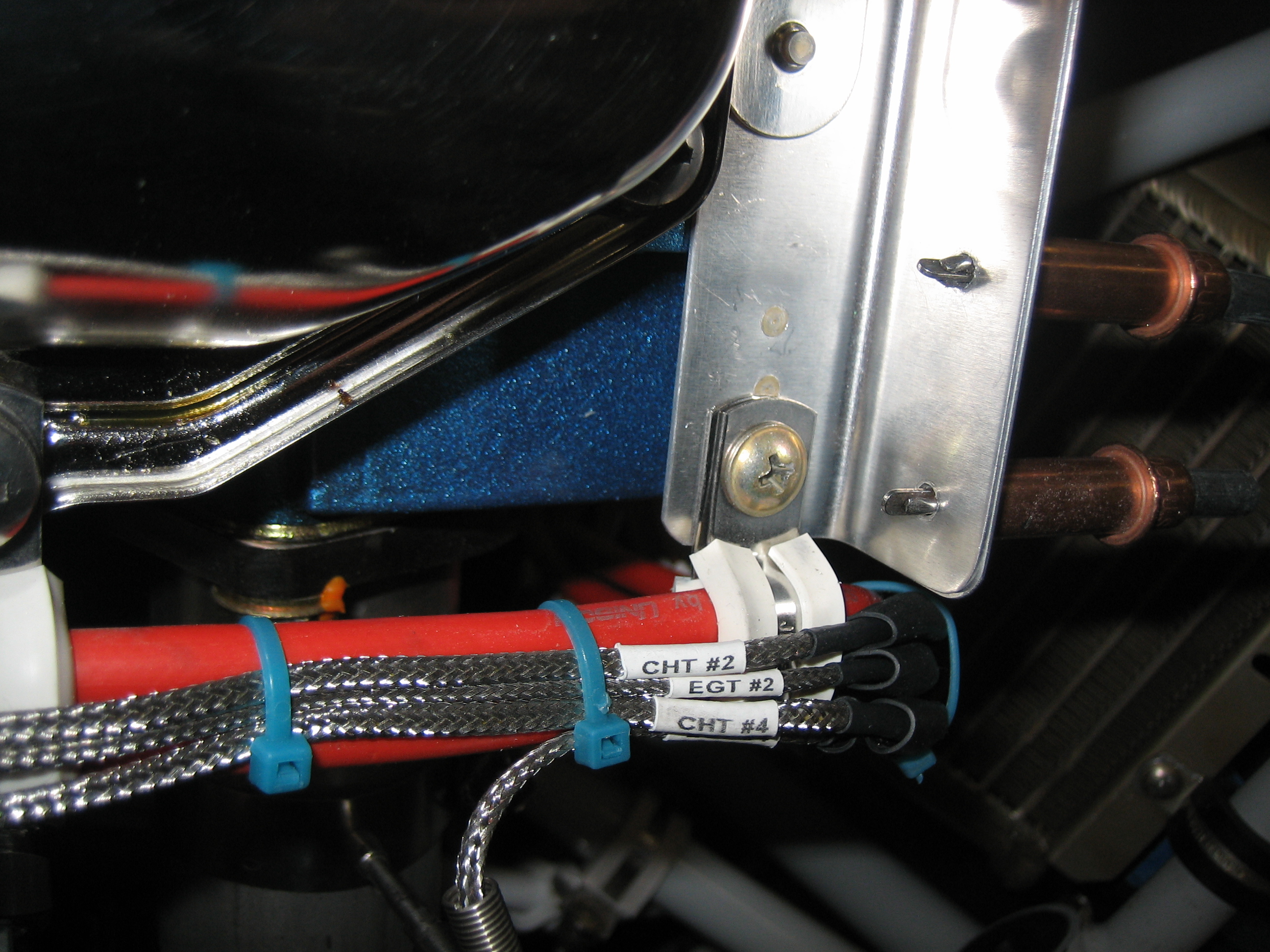The bundle of ignition, EGT and CHT wires running aft from the #4 cylinder weren’t well supported.  I riveted a K2000-3 nutplate to the side baffle and used a two-wire adel clamp to secure the bundle to the baffles.  This prevents these wires from flexing down and contacting the #4 exhaust pipe (or flexing up and contacting the baffles under negative G conditions).  Other than hooking up the starter wire just before first engine start and the coax wires to the electronic ignition coils, I believe all of the firewall forward wiring is complete.  Other than final hookups of wing and empennage components (lights, roll servo, OAT probe, etc.), I believe all of the firewall aft wiring is complete as well.