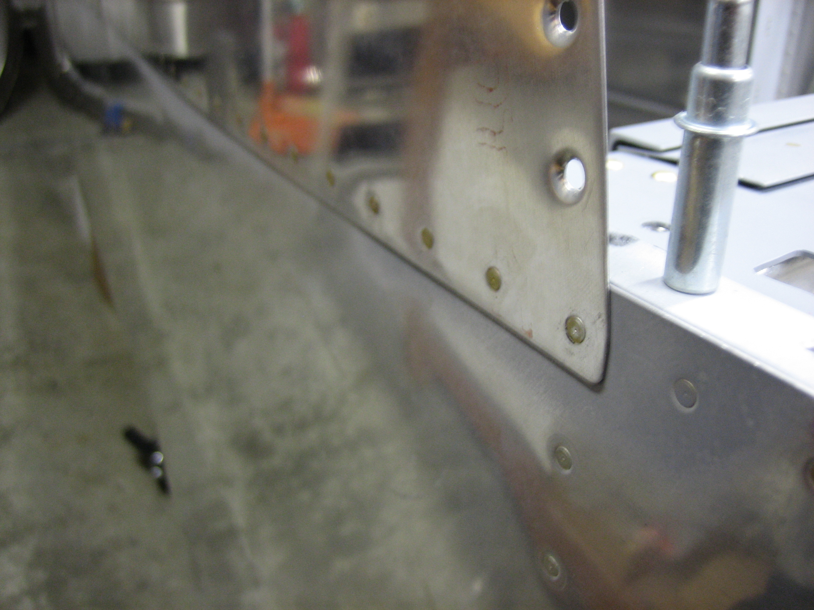 We then riveted these support plates to the longerons and seat support bulkhead. The beefy angles I modified yesterday are installed under here to transfer any roll-over loads into the rest of the structure.