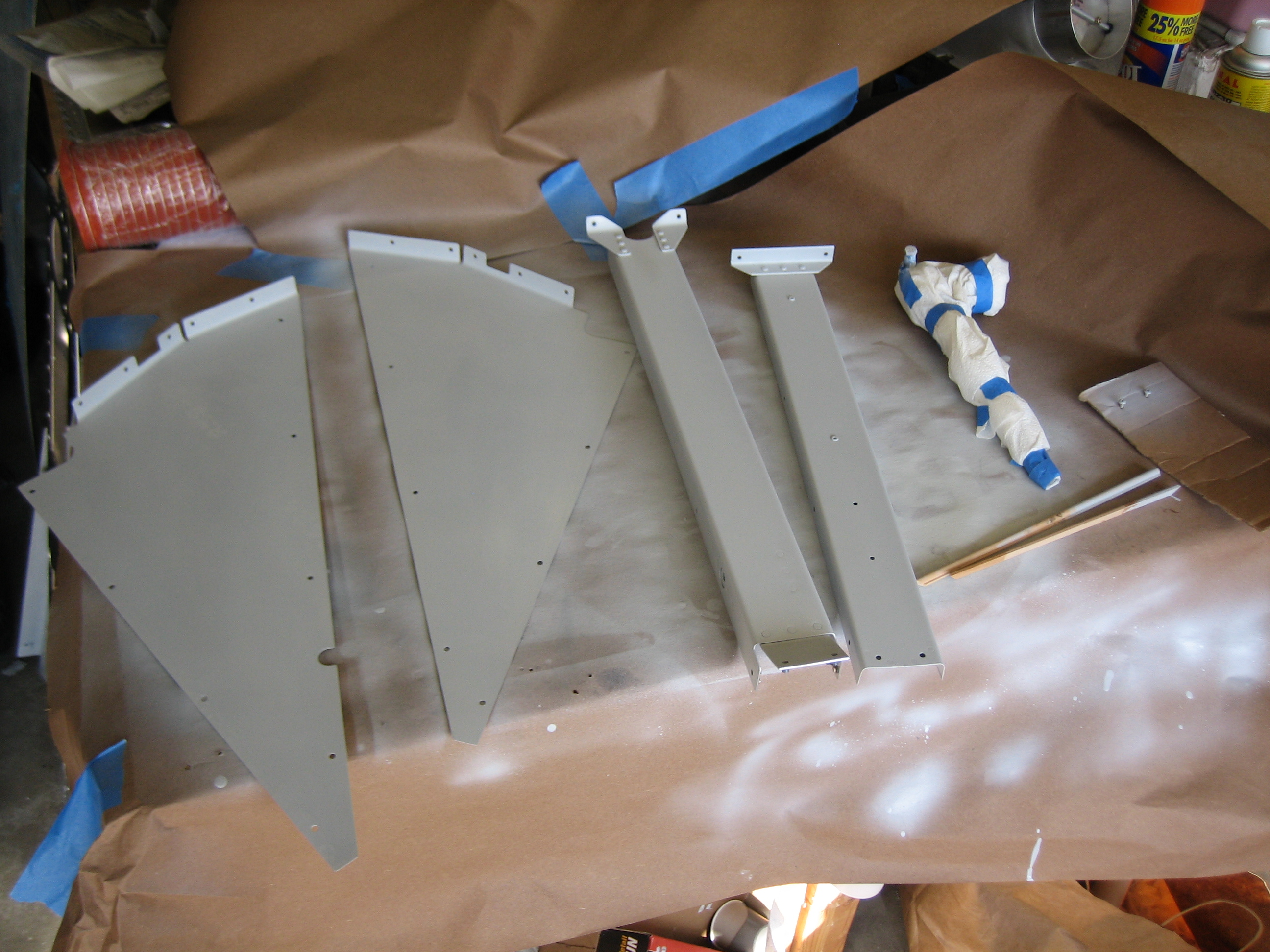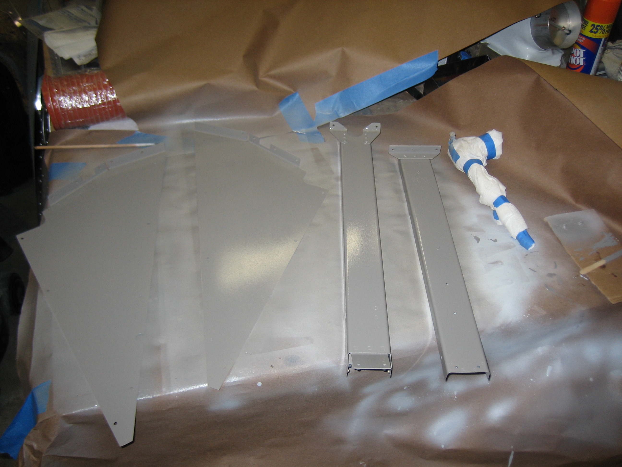 I primed all of the flap cover pieces. On the right is the flap motor wrapped up with paper towels. I primed the head of the bolt that will be visible on the outside of the flap motor support. On the far right is a piece of cardboard with a couple of #6 screws that are used to attach the flap position sensor. I’m painting them as well so they blend in.