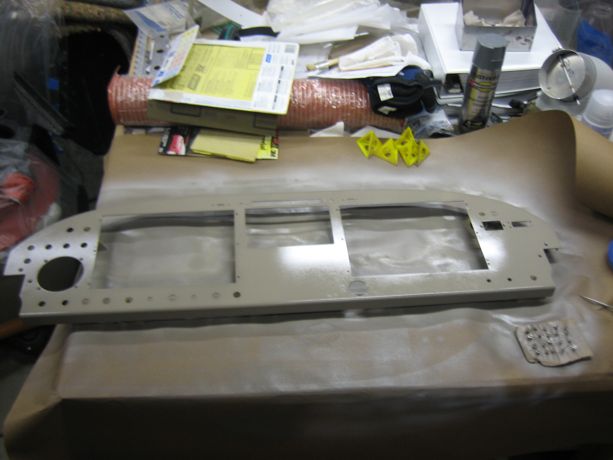 After sanding the instrument panel with 400 grit sandpaper to smooth out a few rough spots, I shot it with the same paint that matches my leather. I *think* I’m going to have to sand this a bit and shoot another top coat, but we’ll see tomorrow. You can see in the lower right of the picture that I also painted all of the screws that will be visible on the panel.