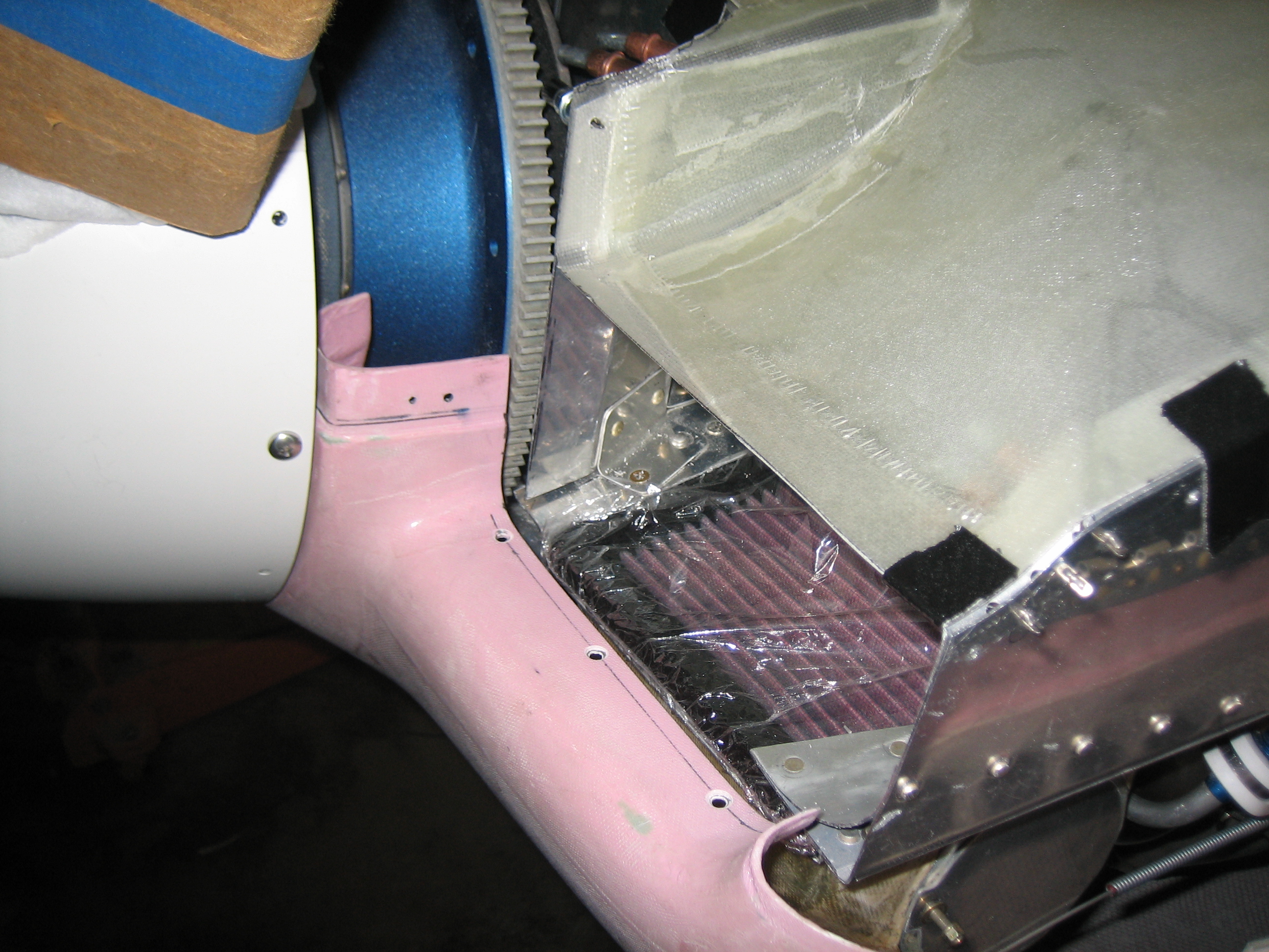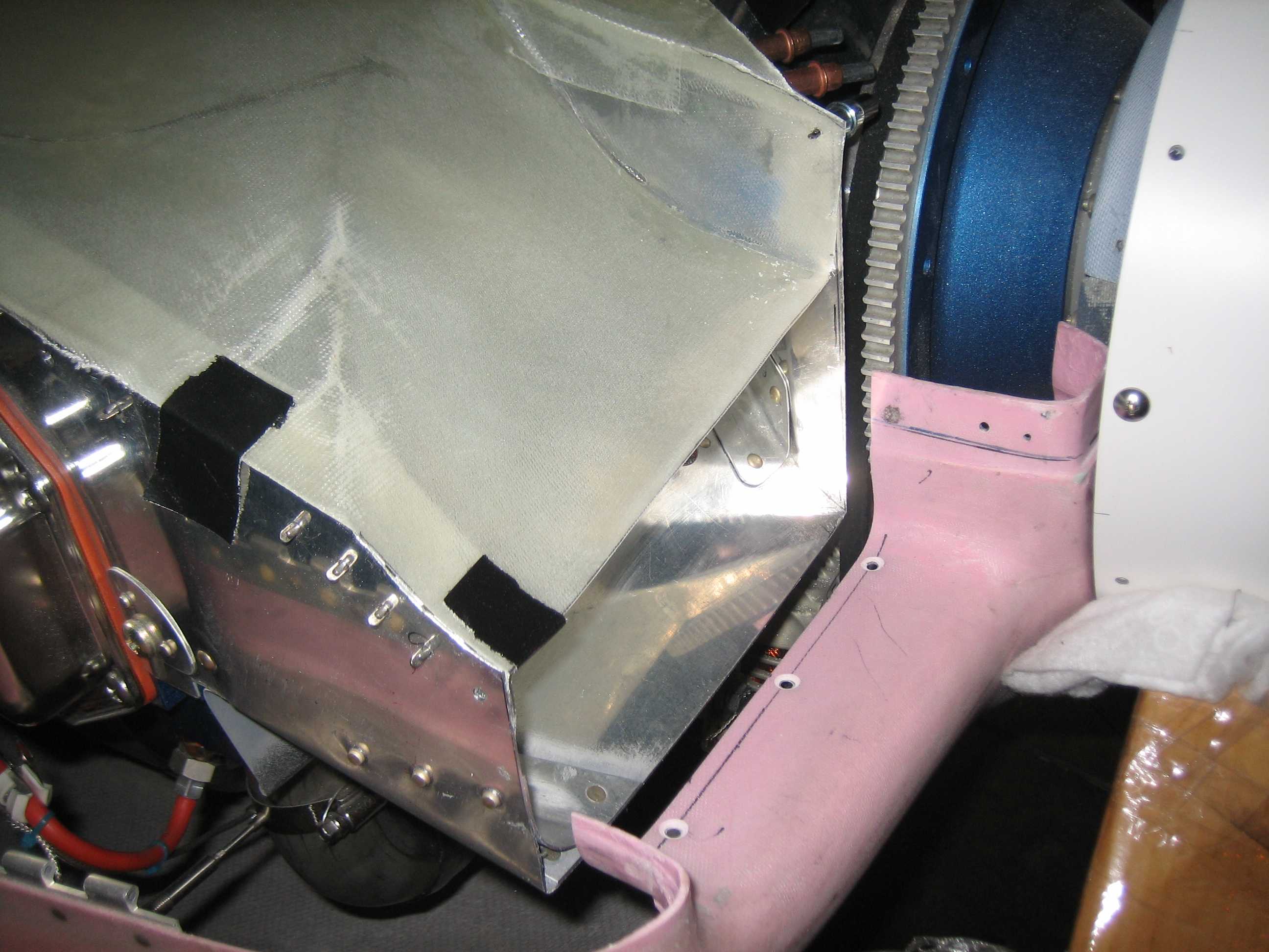 I reinstalled the plenum and adjusted the inlet height so that there’s just enough room for the upper baffle seal material. You can see a small cleco holding this in position just behind the flywheel gear. I then trimmed the plenum back flush with the baffles.