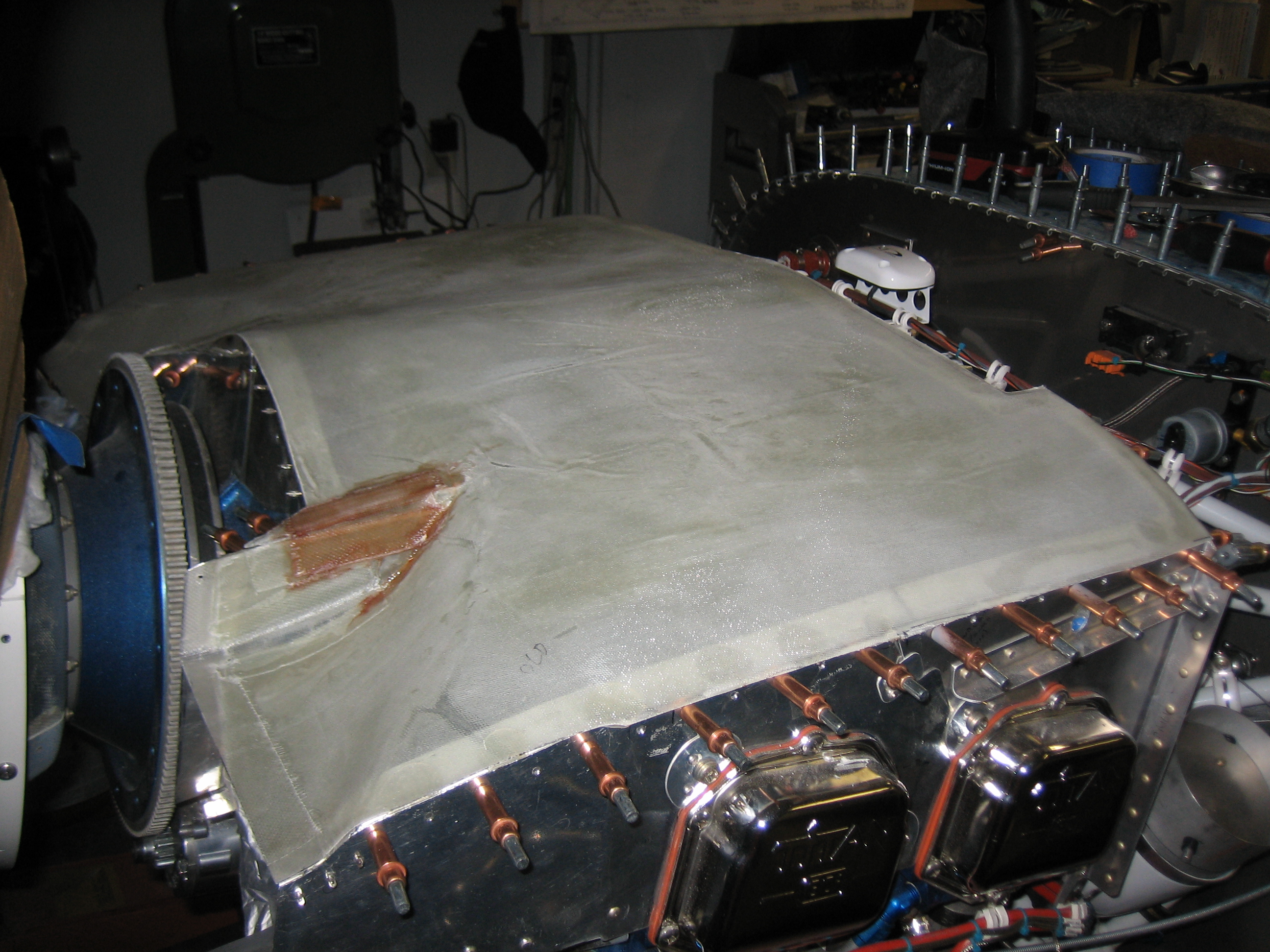 I made one last little tweak to the plenum to get the inner edge of the right inlet to lay flush against the baffles. I used some 5 minute epoxy so that it would be cured enough to do the rest of the layups later in the day.