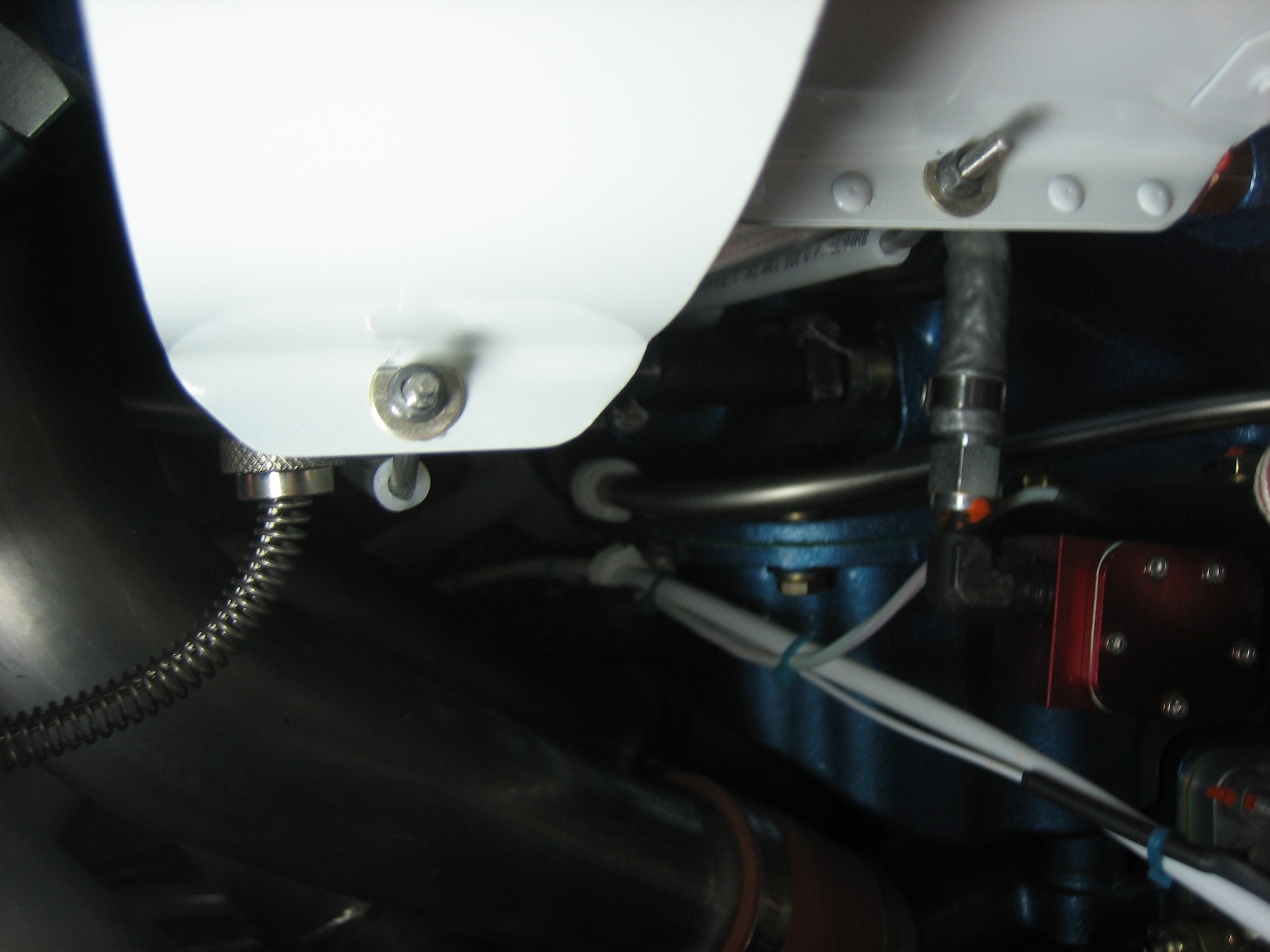 After torquing both ends of the propeller oil line, I reinstalled the support on the bottom of the engine (the shiny clamp on the left here).  I also installed the alternator cooling duct support for good and torqued everything down.