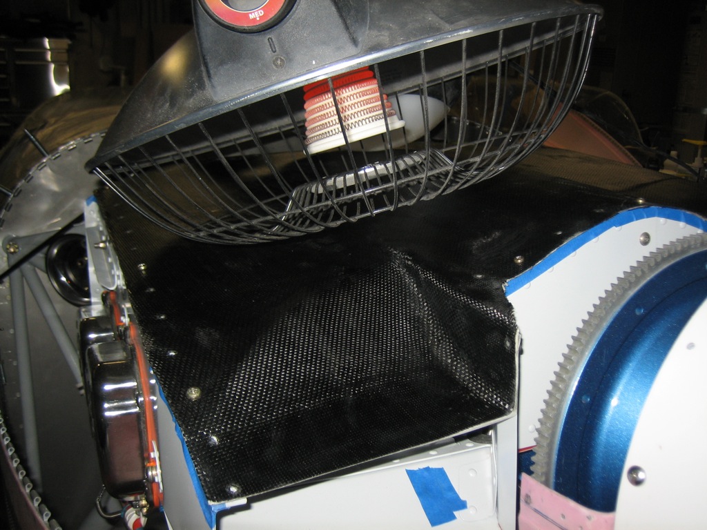 The high-temp epoxy that I used on the plenum needs to be post-cured in order to withstand the high temperatures it will be exposed to after engine shutdown. I took it down to the Tech Shop and used their large powder coating over to cure it at 150º for three hours. The heat substantially softened it and it flattened out a bit in the oven. After I brought it home, it didn’t really fit the baffles correctly and would have cracked if I tried to force it into position. I set up my space heater over each side and heated the plenum past 150º and it softened right up. I then pushed it into position and screwed it down. This worked beautifully, and the plenum now fits the baffles really well.