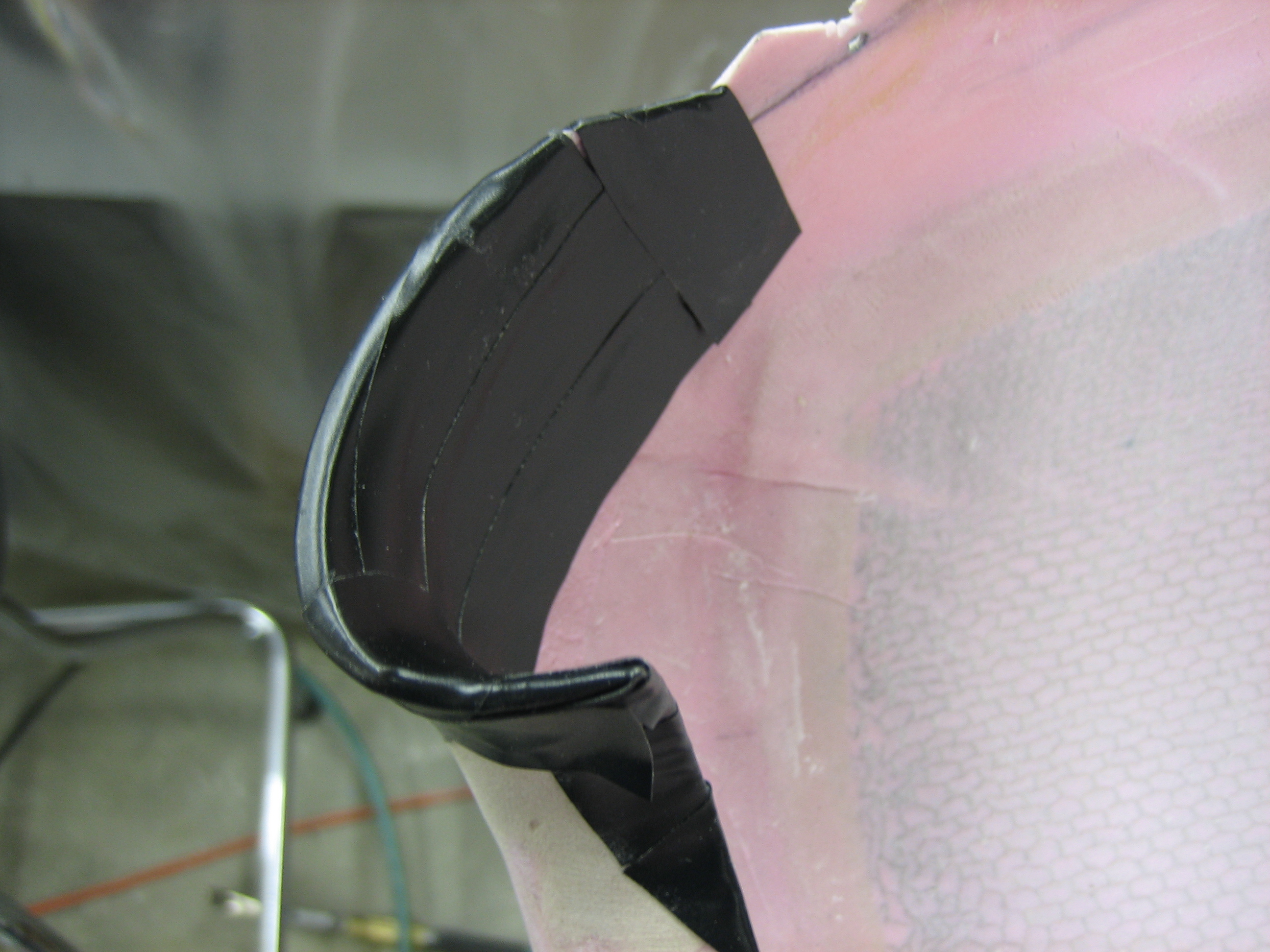 Where the upper and lower cowl halves meet on the outer ends of the inlets, the top and bottom sections simply butt together.  There is nothing tying the two parts of the cowl together at this point which allows some relative movement, and air entering through the gap is just added drag since it doesn’t help with engine cooling as it’s dumped directly into the low-pressure area outside the baffles.  To address this, I’m adding some flanges to the lower cowl that the upper cowl will nestle over.  This will reinforce this area a bit and seal the gap.  To prevent the epoxy from sticking to the upper cowl, I covered this area with electrical tape.  I would normally use packing tape, but it can’t conform to the curves like electrical tape can.