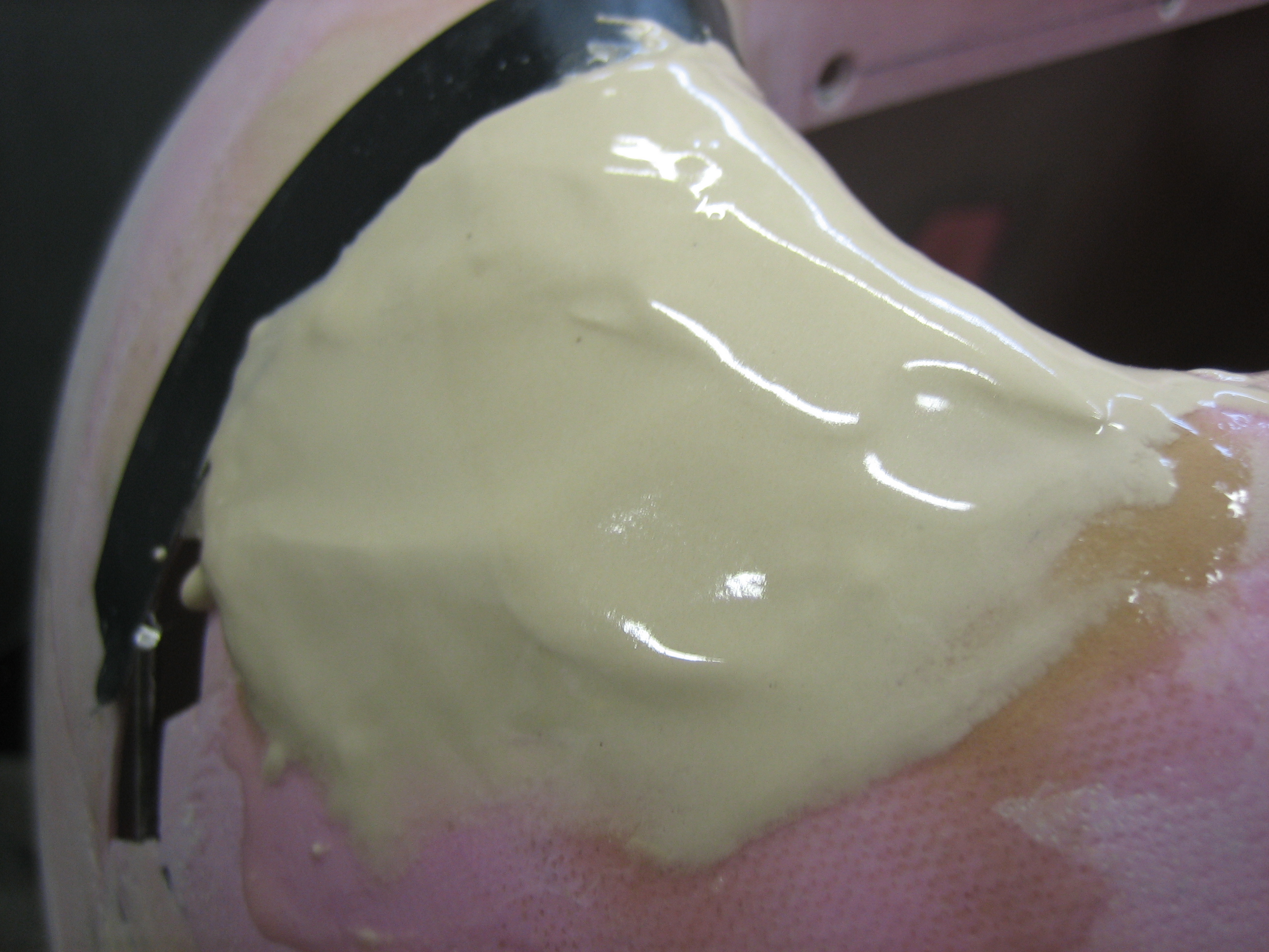 Anyway, I mixed up another coat of epoxy with microlight and built up a little bit more around the air inlets. Here’s the upper cowl on the outside edge of the right inlet. The electrical tape is preventing the filler from lapping over onto the lower cowl and will provide a nice reference when sanding this to shape.