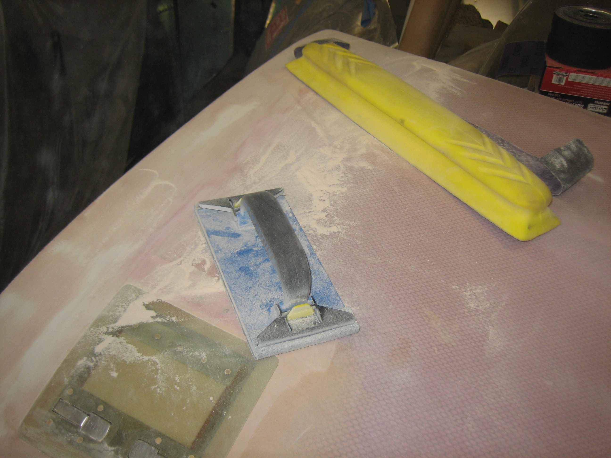 I used a vixen file to rough shape all of the filler I applied a couple of days ago and then sanded everything until you can’t even feel the gap between the upper and lower cowl halves.  I’ll need to open the gap up slightly for paint, but the shape is nearly perfect.  Next, I started flattening the filler on the upper cowl.  I previously picked up this longer flexible sanding block from Harbor Freight.  It has a spring steel plate on the bottom which is flexible enough to conform to gentle curves, but flat enough to sand the surface and eliminate all the waves in the surface.