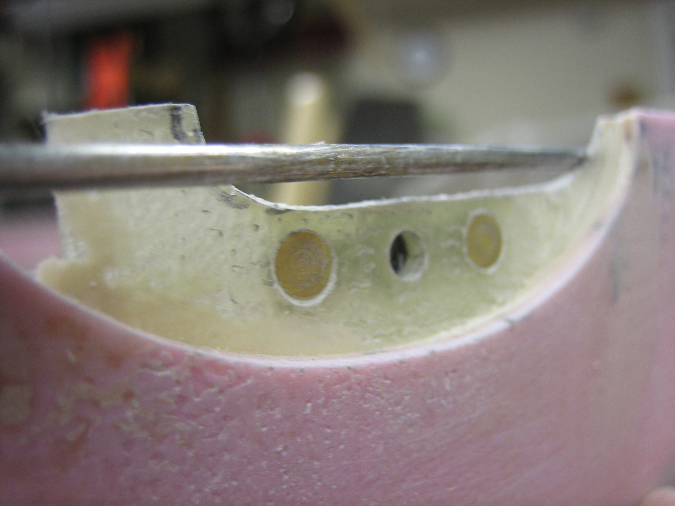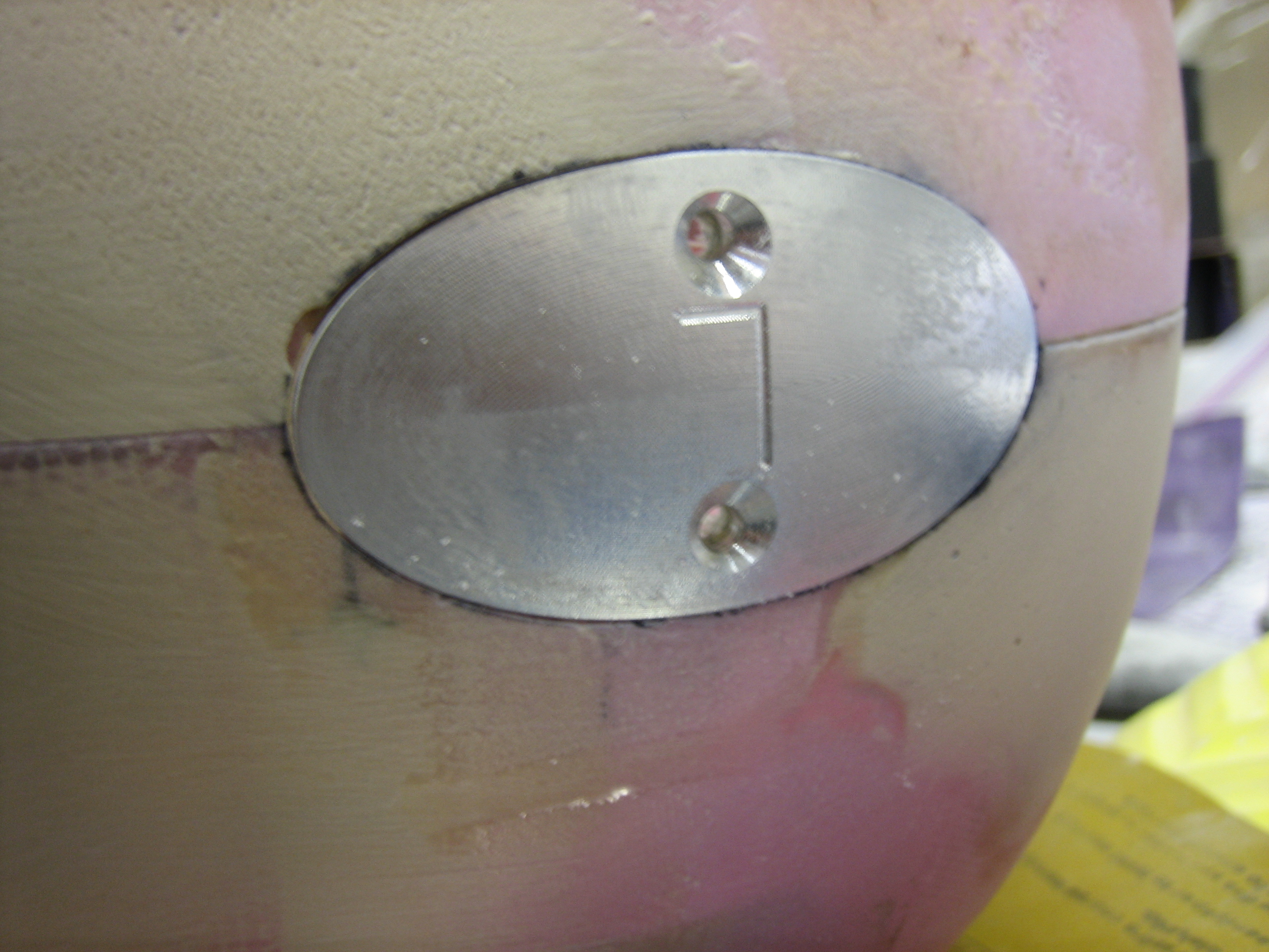 I drilled through the holes with a #27 drill bit, then popped the covers out.  These are not the final covers, but slightly oversize covers used for forming the recesses.  The actual covers are smaller for paint clearance, highly polished and have the text “RV-7” engraved in them.  I still need to apply a little more filler around the edges to create a perfect fit.