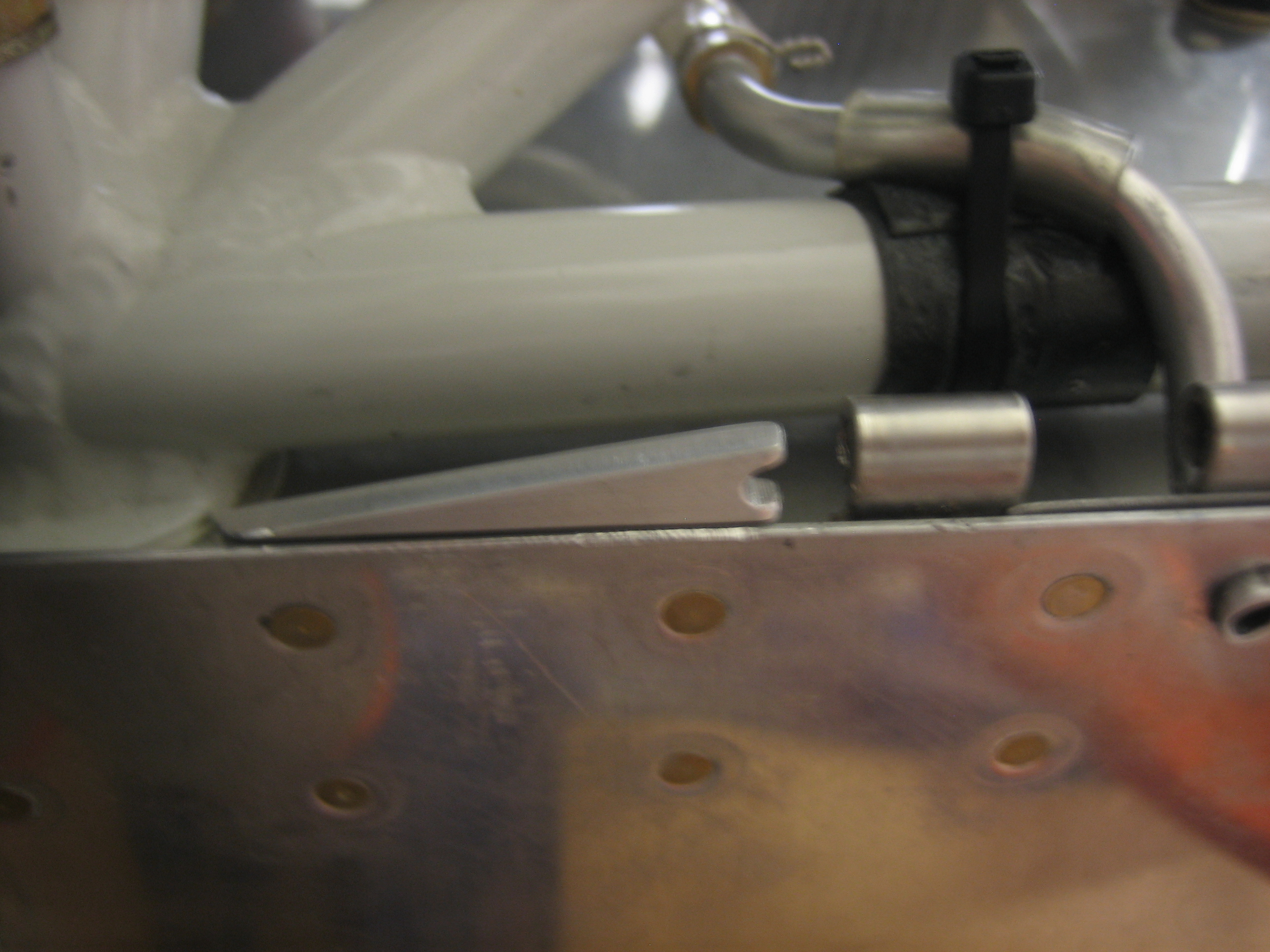 I’ve been mulling over how to retain the bottom hinge pins on the lower cowl. I wanted something that didn’t require any tools to remove but also wasn’t visible externally. I finally stumbled on a solution that I’m happy with. I fabricated a couple of clips that are riveted to the bottom flange of the firewall. They started as 1/8″ thick flat stock that I filed to about half thickness where it rivets to the firewall flange. It’s full thickness where the pin latches for added strength and bearing surface.