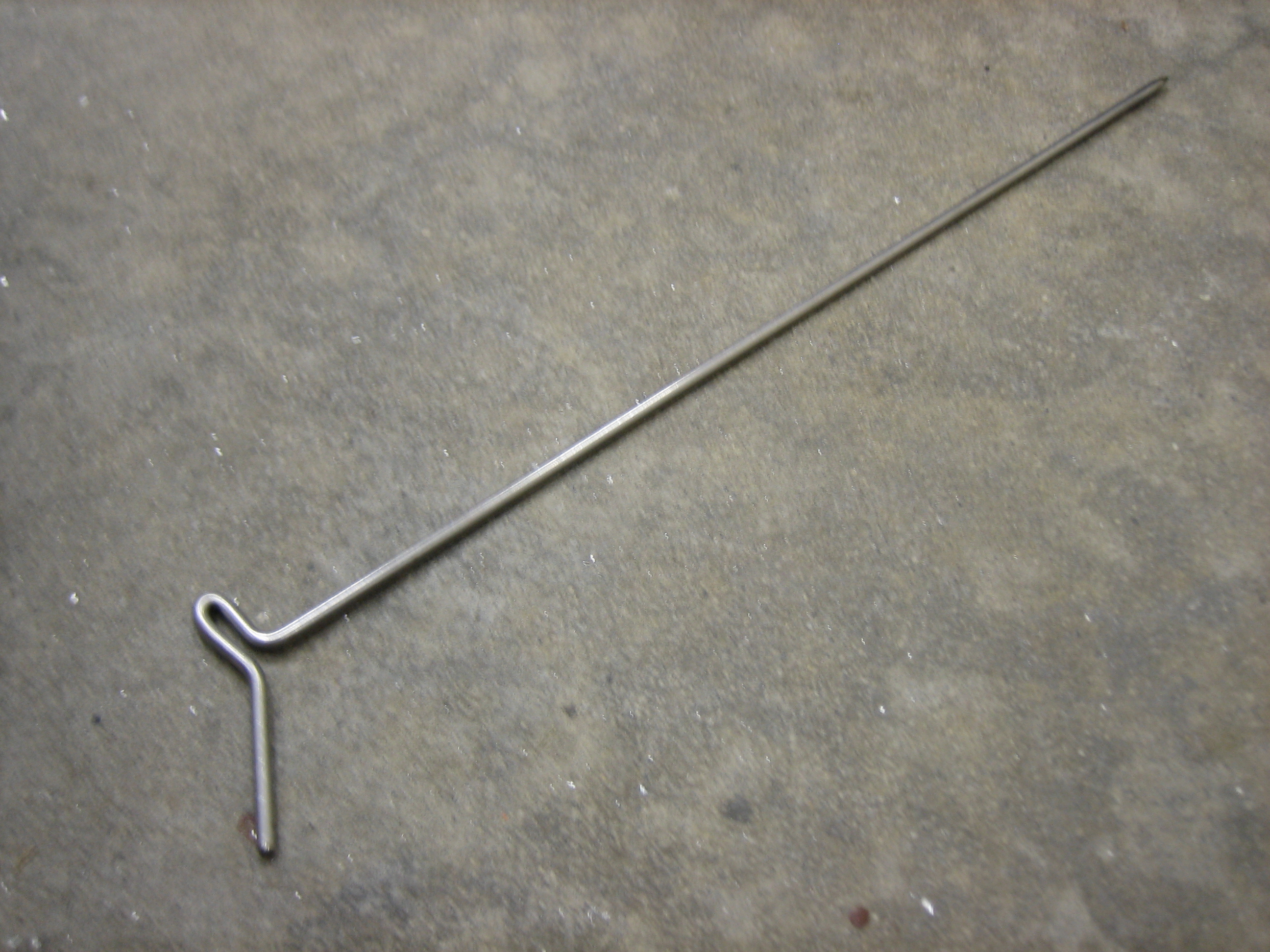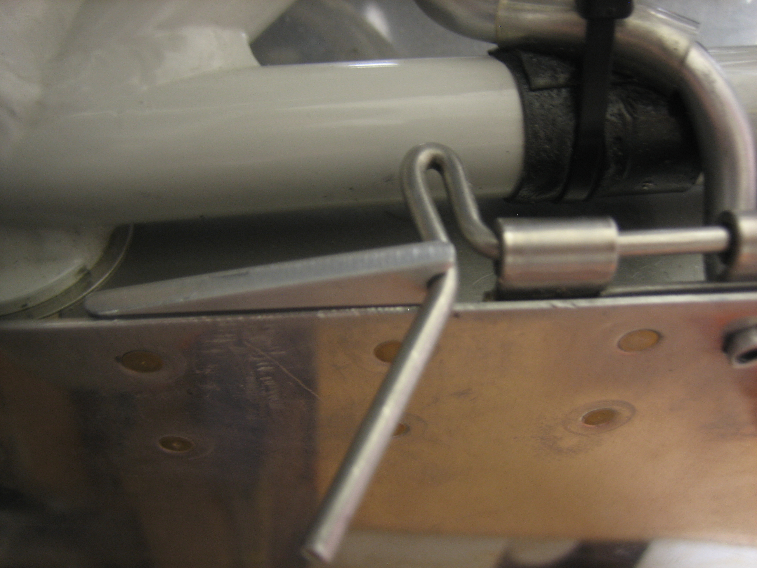 Here’s how the pin clips into place. The lower part of the pin is hidden just inside the cowl exit, but it can easily be reached and released. Since the notch is below the line of the hinge eyelets, you just have to flex the lower end outward and pivot it forward to release.