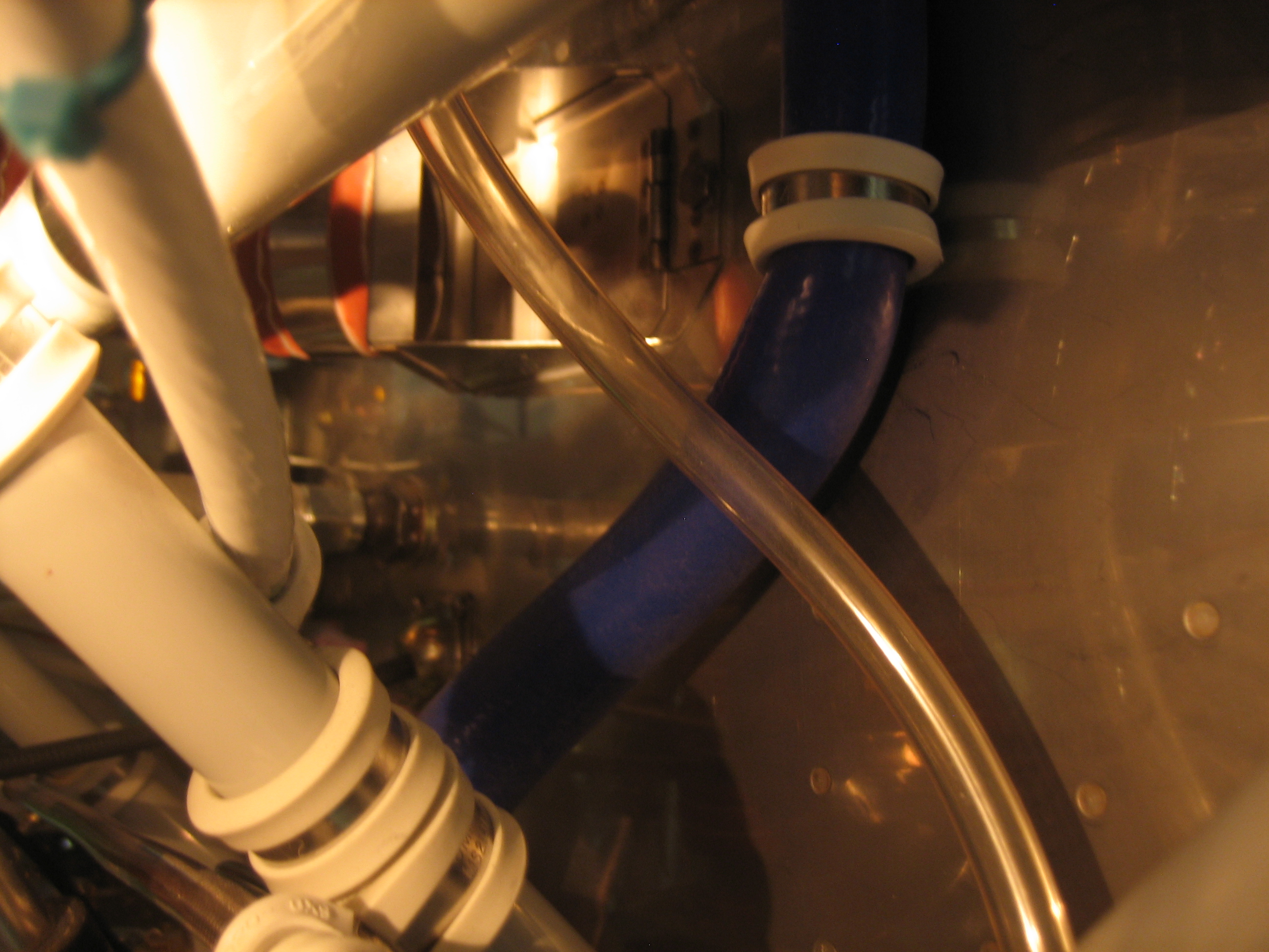 The drain line goes through a clamp on the firewall and then into the vacuum valve.
