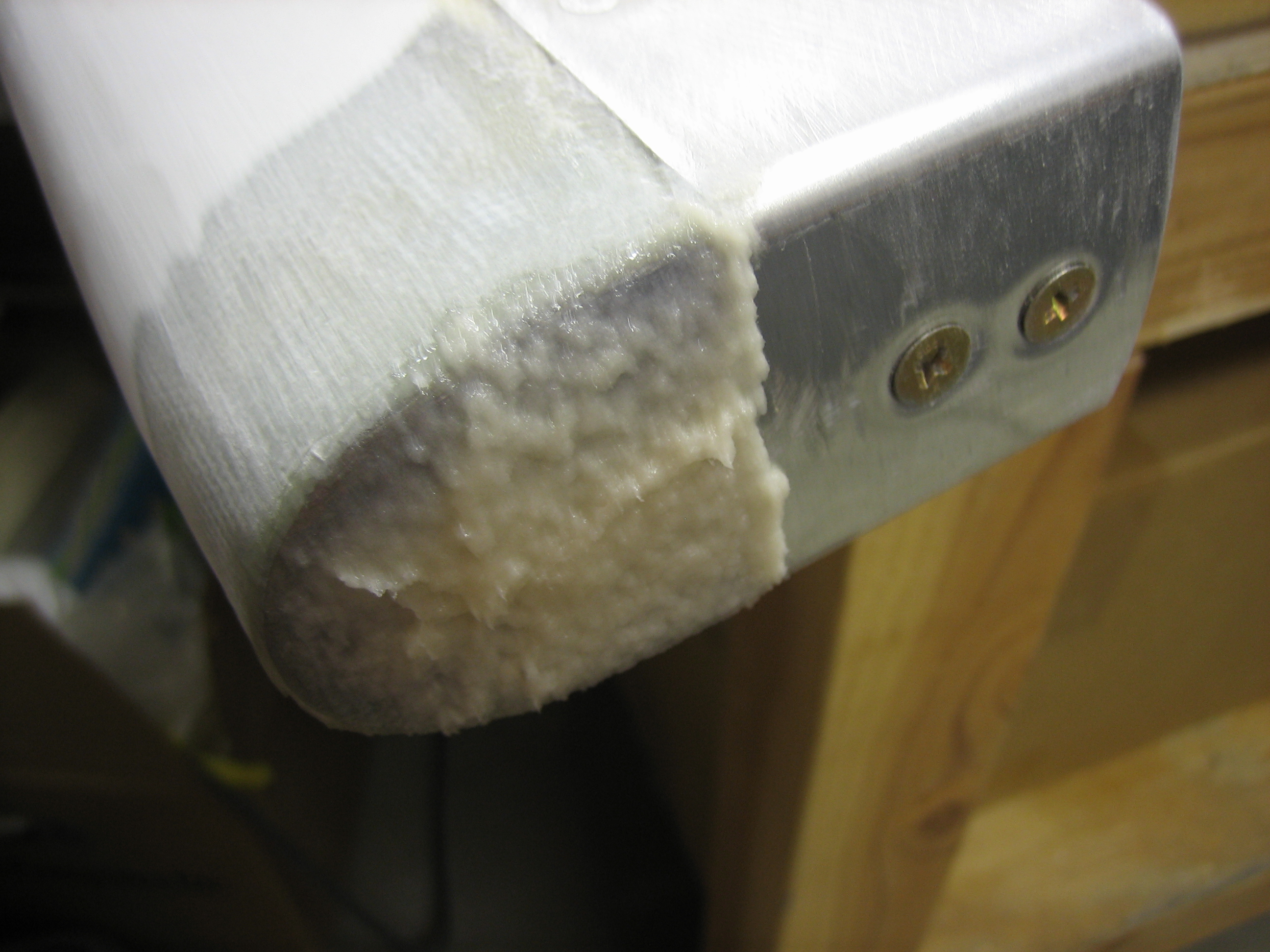 I only had a few minutes tonight, but I needed to take care of a bit of filler on the right elevator before laying up the glass over the joint.  The trailing edge of the tip fairing didn’t go all the way back to the trailing edge of the elevator skin, so I mixed up some epoxy/flox and filled in the gap.