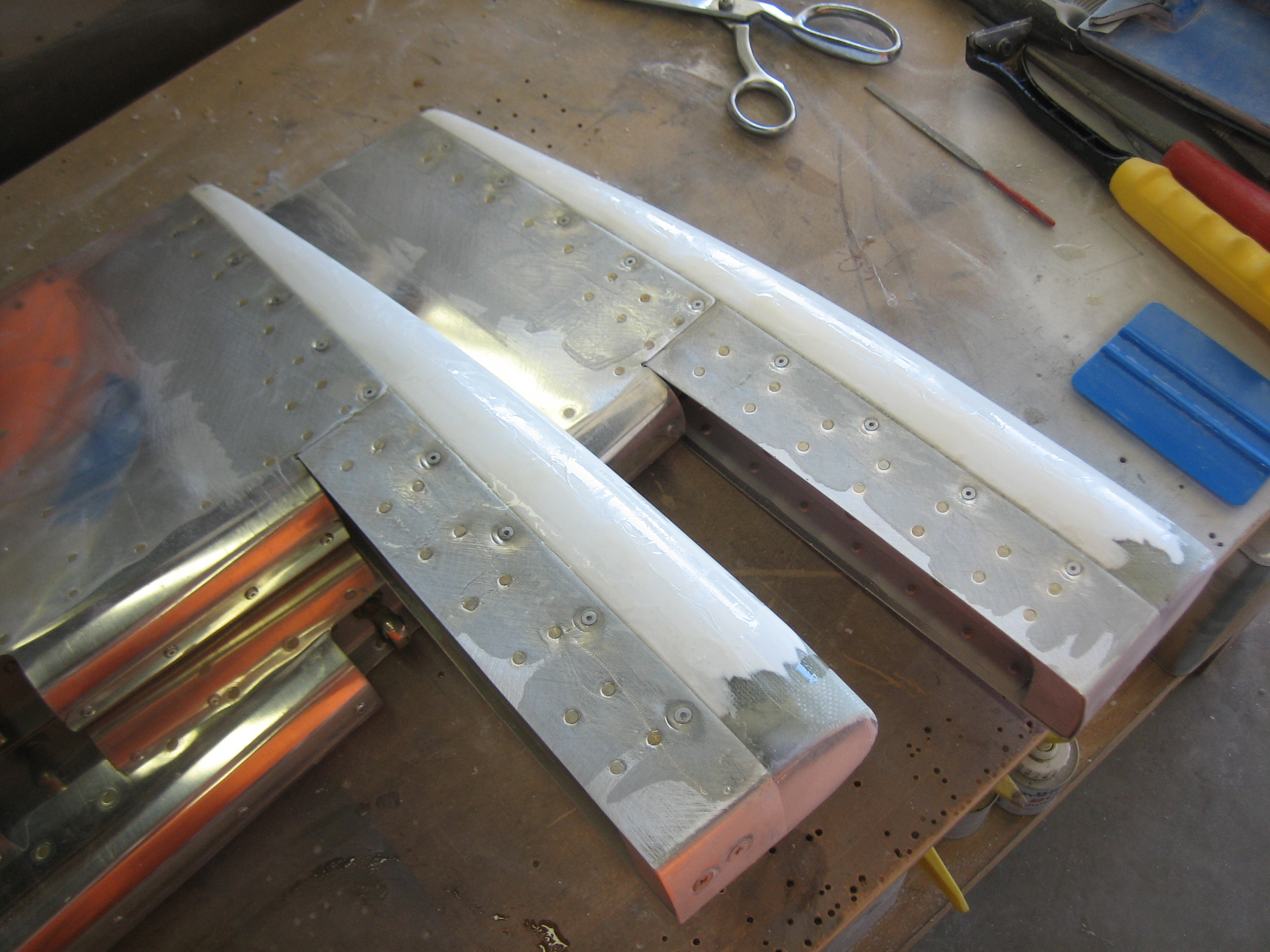 Glassed Other Side of Elevators Leave a comment October 5, 2013 jason I glassed the other side of the elevators tonight. I also filed down the leading edge of the rudder and wrapped it in glass.